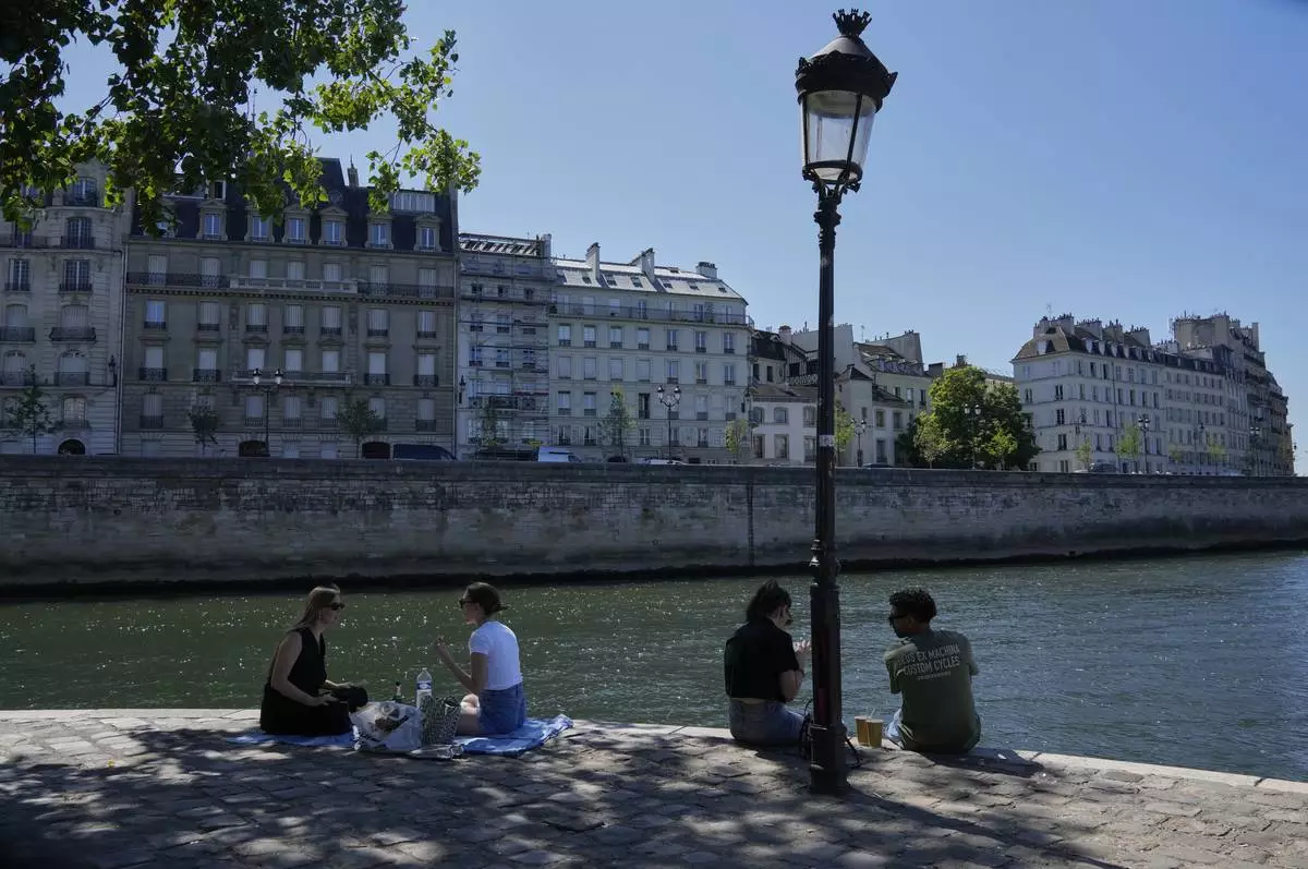 People sit in the shade along the Seine river in Paris, Sunday, June 29, 2025. (AP Photo/Michel Euler)