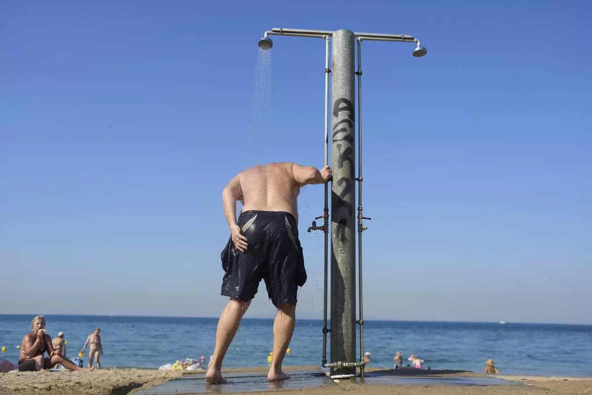 A man takes a shower at Alimos beach near Athens, Thursday, June 26, 2025, as the summer's first heat wave hits Greece, with temperatures expected to edge over 40 degrees Celsius, (104 Farenheit). (AP Photo/Petros Giannakouris)