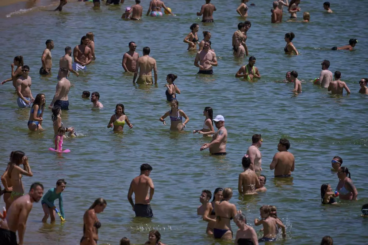 Swimmers cool off in the water at a beach on a hot day in Barcelona, Spain, Saturday, June 28, 2025. (AP Photo/Emilio Morenatti)