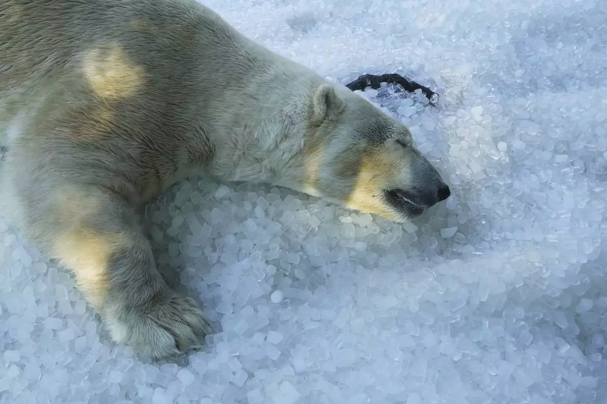 A polar bear cools down on a pile of ice that was brought to its enclosure on a hot and sunny day at the Prague zoo, Czech Republic, Tuesday, July 1, 2025. (AP Photo/Petr David Josek)