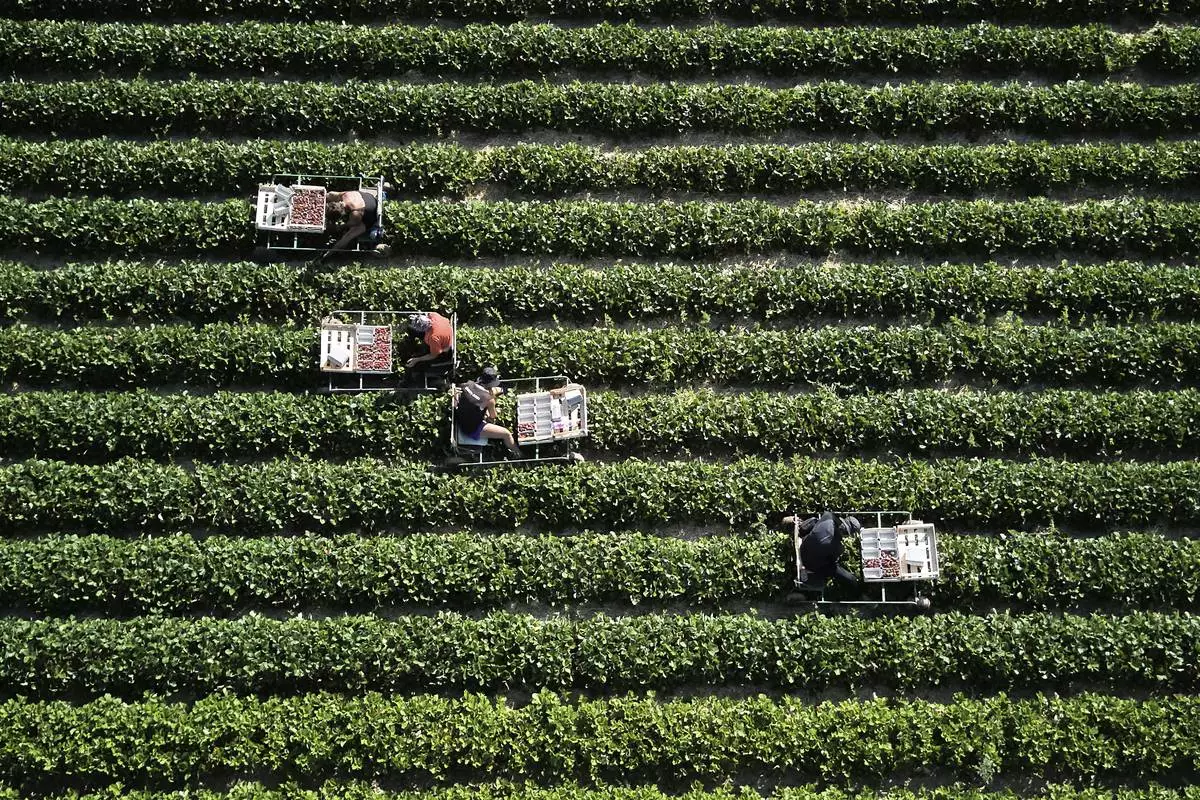 Harvest helpers harvest strawberries in a field on the outskirts of Frankfurt, Germany, Monday, June 30, 2025. (AP Photo/Michael Probst)