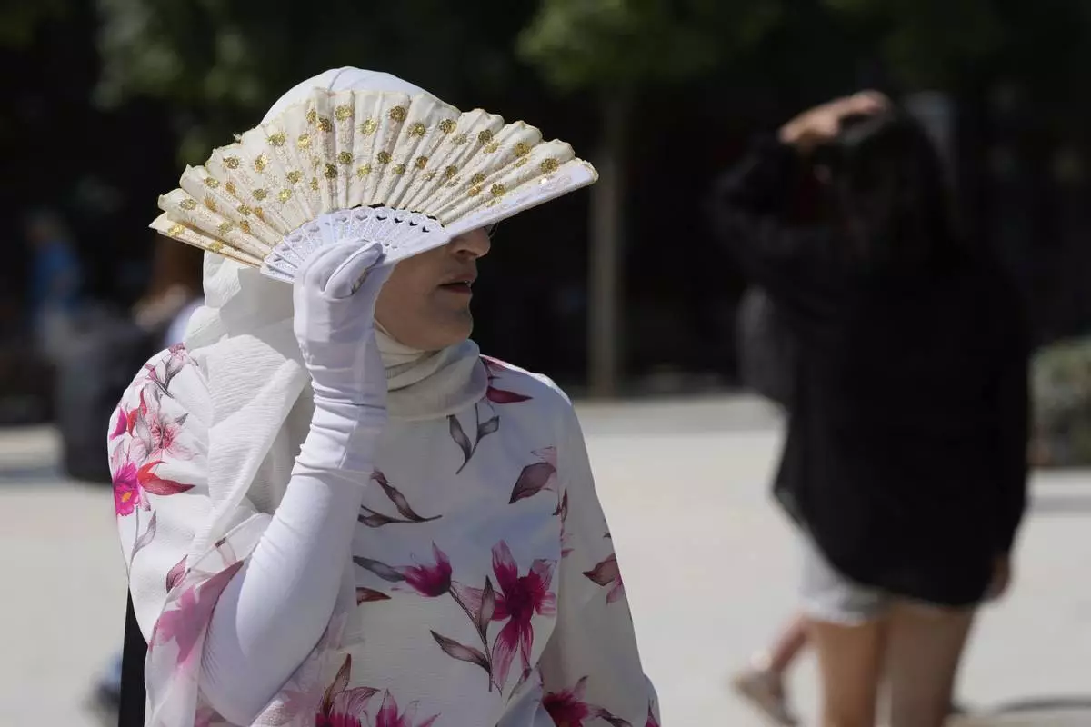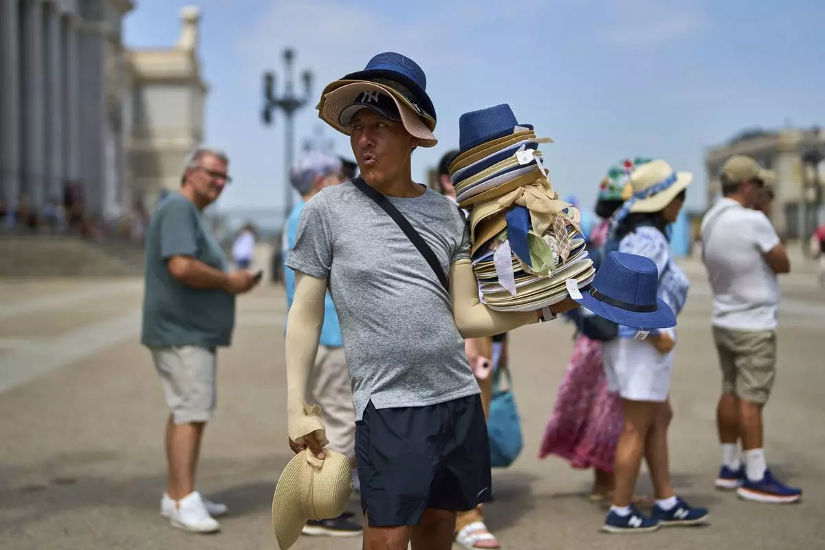 A vendor sells hats during a heat wave in Madrid, Spain, Tuesday, July 1, 2025. (AP Photo/Manu Fernandez)