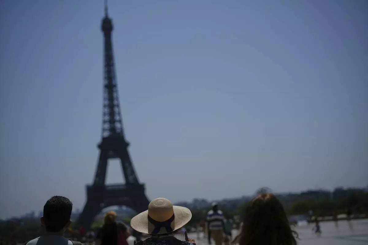 People look at the Eiffel Tower at Trocadero plaza during a heat wave in Paris, France, Wednesday, July 2, 2025. (AP Photo/Christophe Ena)