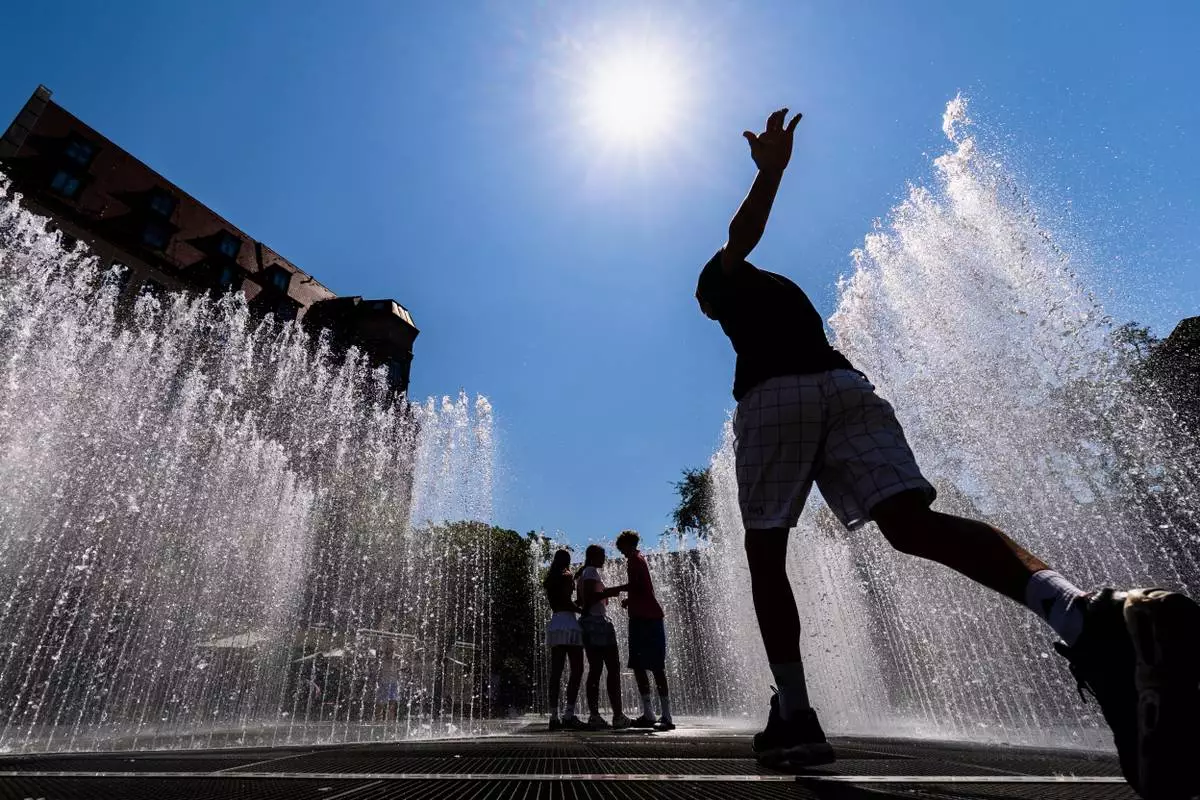 Tourists use a water fountain during a heat wave, Tuesday, July 1, 2025 in Paris. (AP Photo/Christophe Ena)