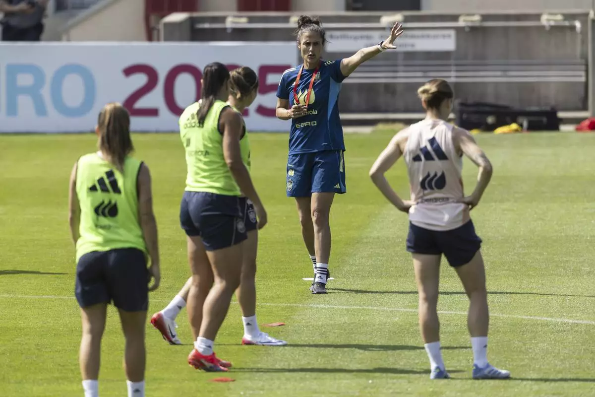 Spanish head coach Montserrat Tome Vazquez, rear center, gestures during the training session of the Spanish women's national football team in Lausanne, Switzerland, Monday, June 30, 2025, ahead of the UEFA Women's EURO 2025. (Cyril Zingaro/Keystone via AP)
