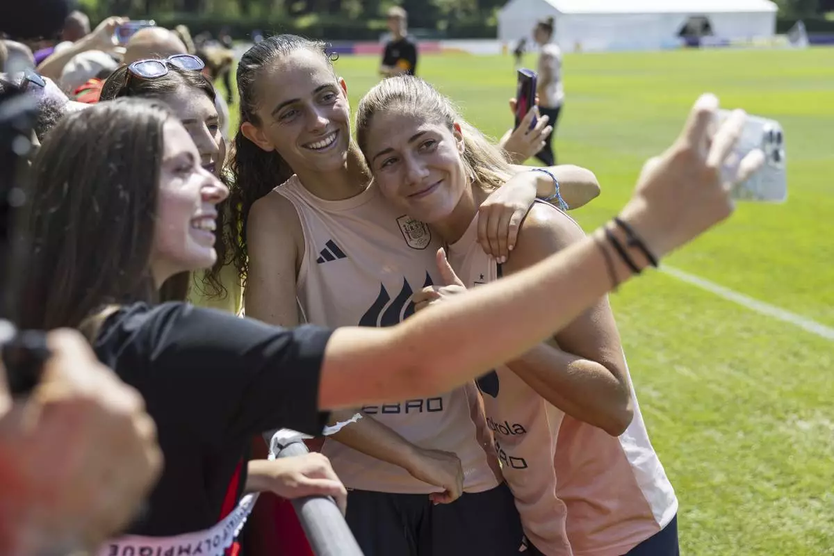 Spain's Maite Zubieta, left, and Laia Aleixandri, right, poses with fans for a selfie during a training session of the Spanish women's national football team in Lausanne, Switzerland, Monday, June 30, 2025, ahead of the UEFA Women's EURO 2025. (Cyril Zingaro/Keystone via AP)