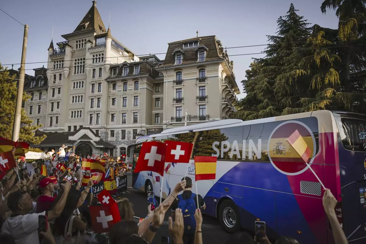 Fans react to the arrival of the Spain's women's national football team at their hotel, the Royal Savoy in Lausanne, Switzerland, on the sidelines of the UEFA Women's Euro 2025, Sunday, June 29, 2025. (Gabriel Monnet/Keystone via AP)