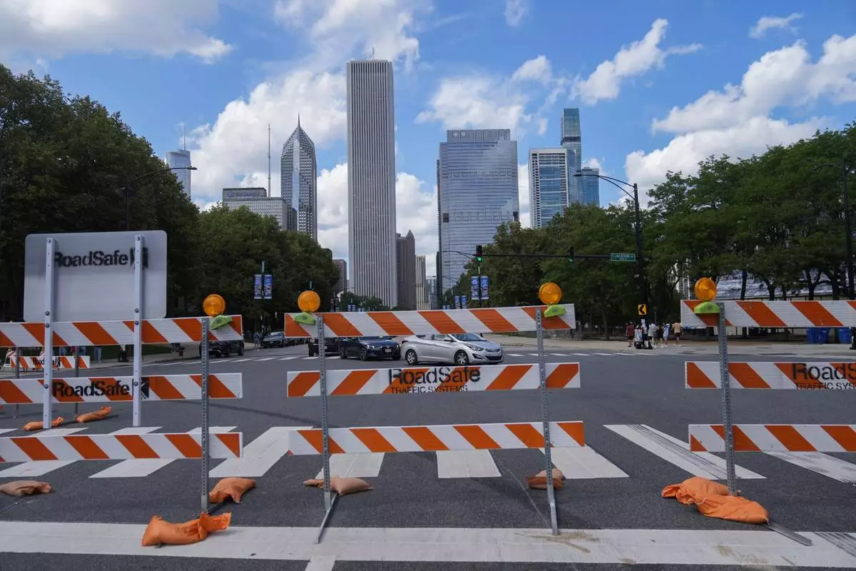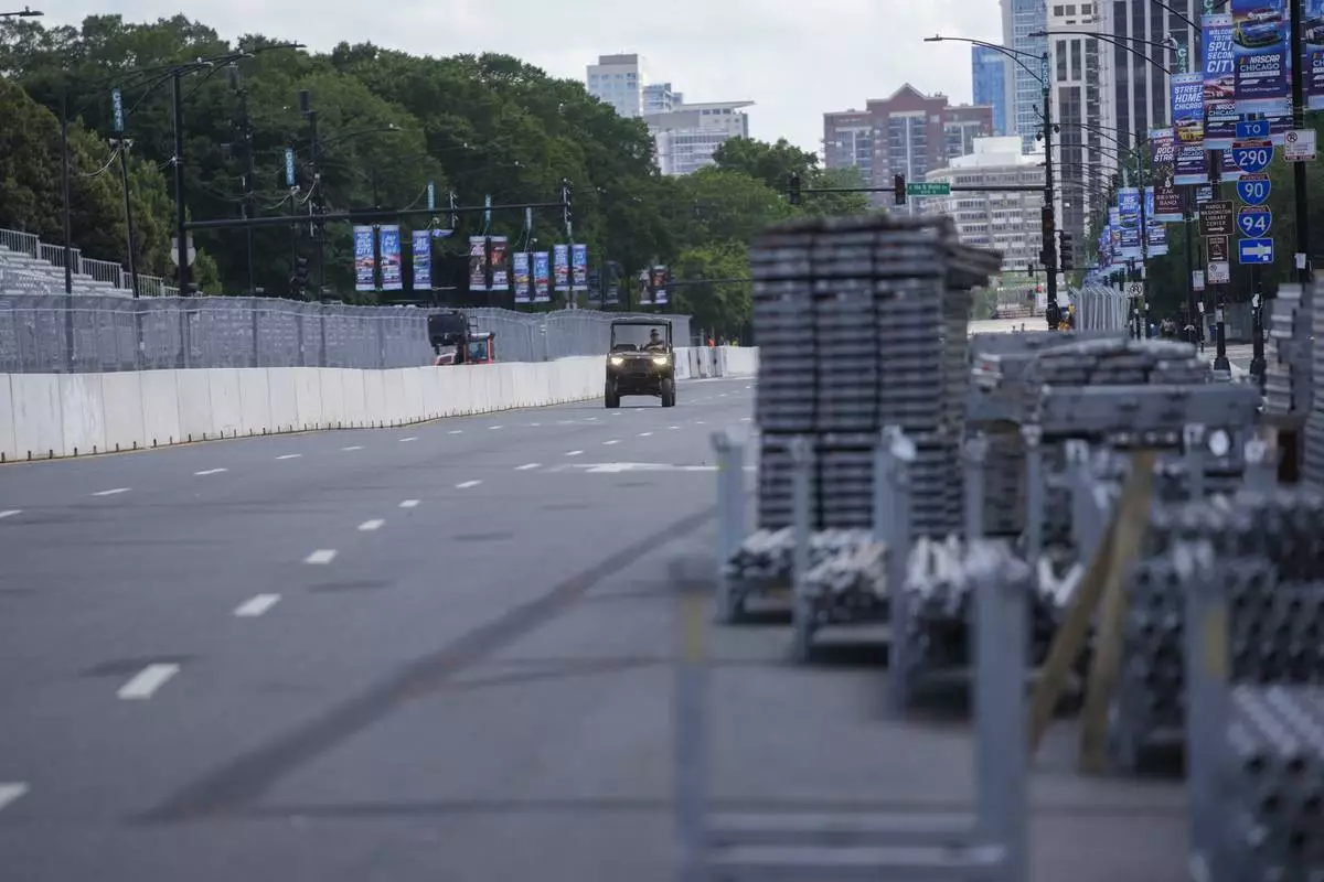 Construction of the street course continues ahead of the NASCAR auto racs, Friday, June 27, 2025, in downtown Chicago. (AP Photo/Erin Hooley)