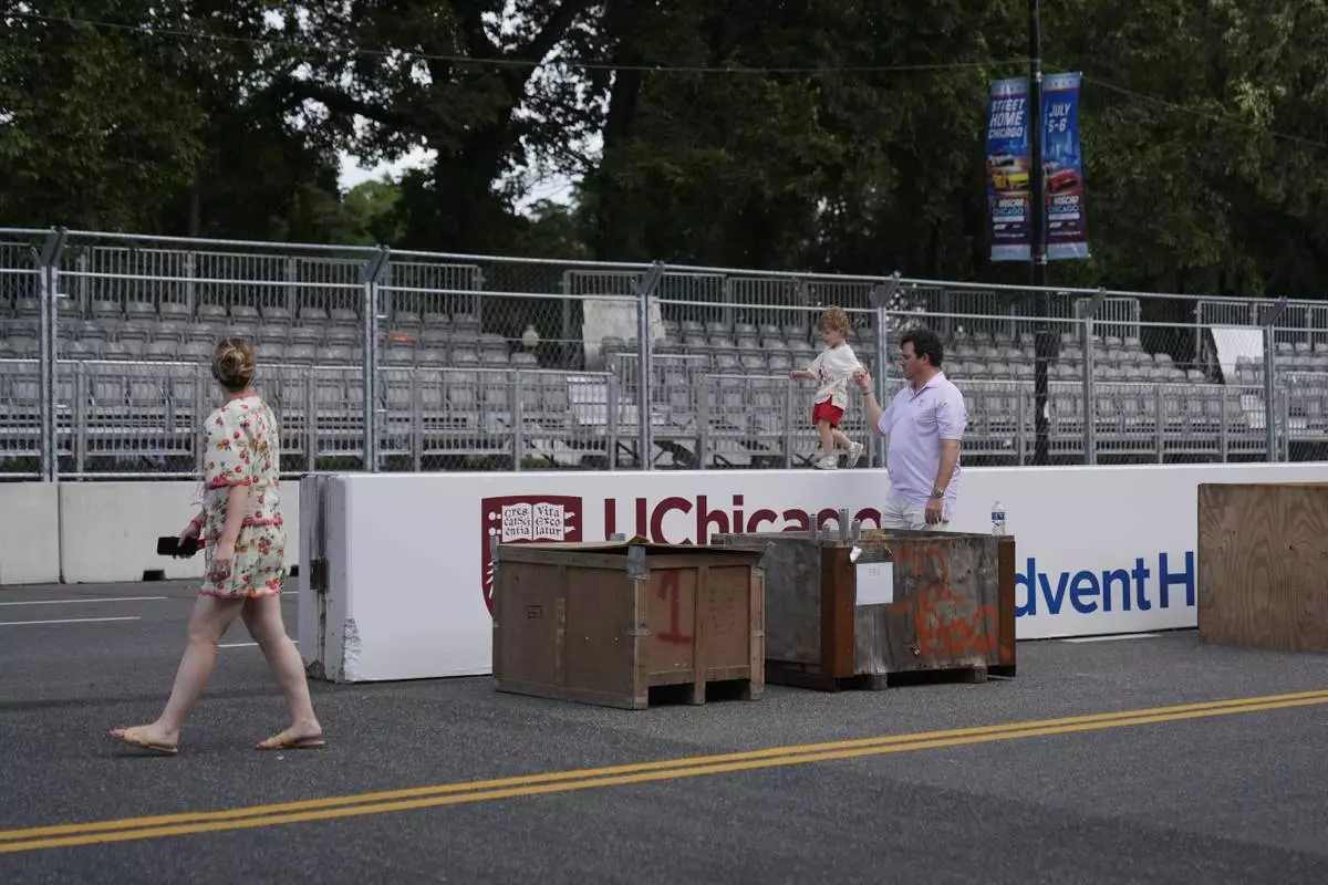 People walk by as construction of the street course continues ahead of the NASCAR auto racs, Friday, June 27, 2025, in downtown Chicago. (AP Photo/Erin Hooley)