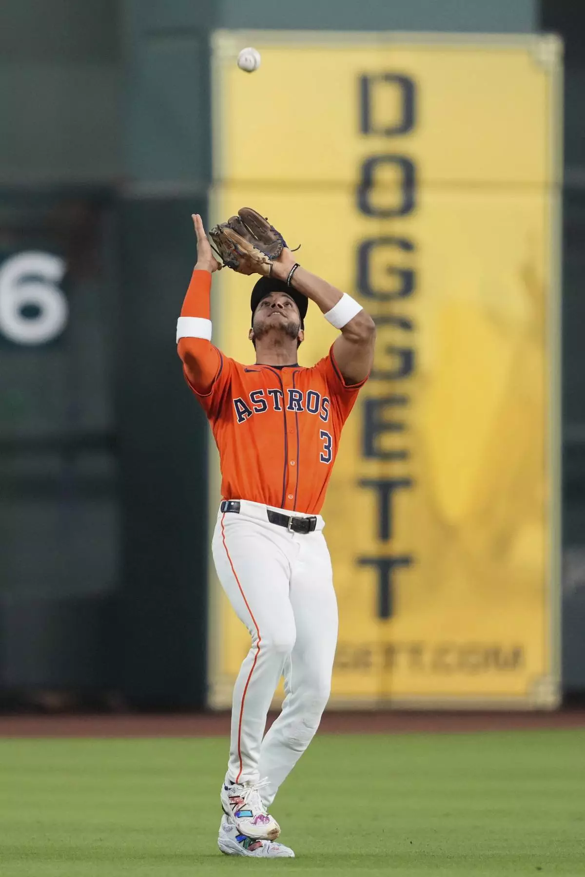 Houston Astros shortstop Jeremy Pena catches a fly ball hit by Chicago Cubs' Kyle Tucker during the first inning of a baseball game in Houston, Friday, June 27, 2025. (AP Photo/Ashley Landis)