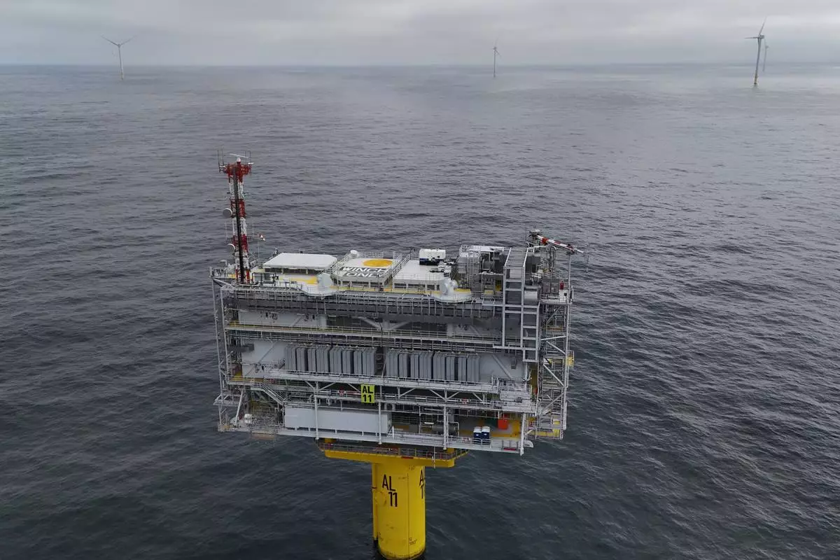 The Revolution Wind command center or substation for the offshore wind farm is visible off the coast of Rhode Island, Thursday, April 23, 2026. (AP Photo/Joshua A. Bickel)