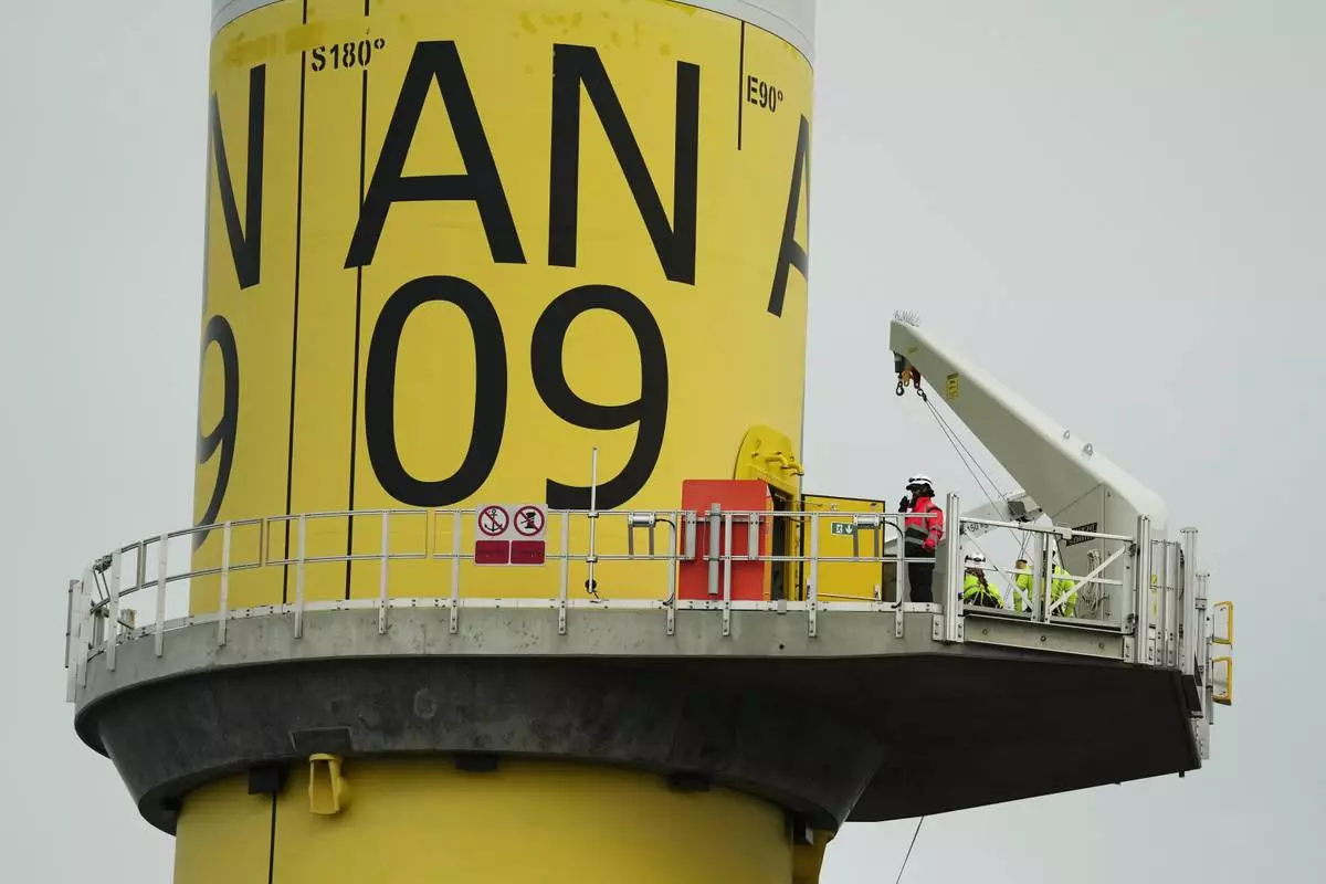 People work on a turbine at South Fork Wind offshore wind farm off the coast of Block Island, R.I., Thursday, April 23, 2026. (AP Photo/Joshua A. Bickel)