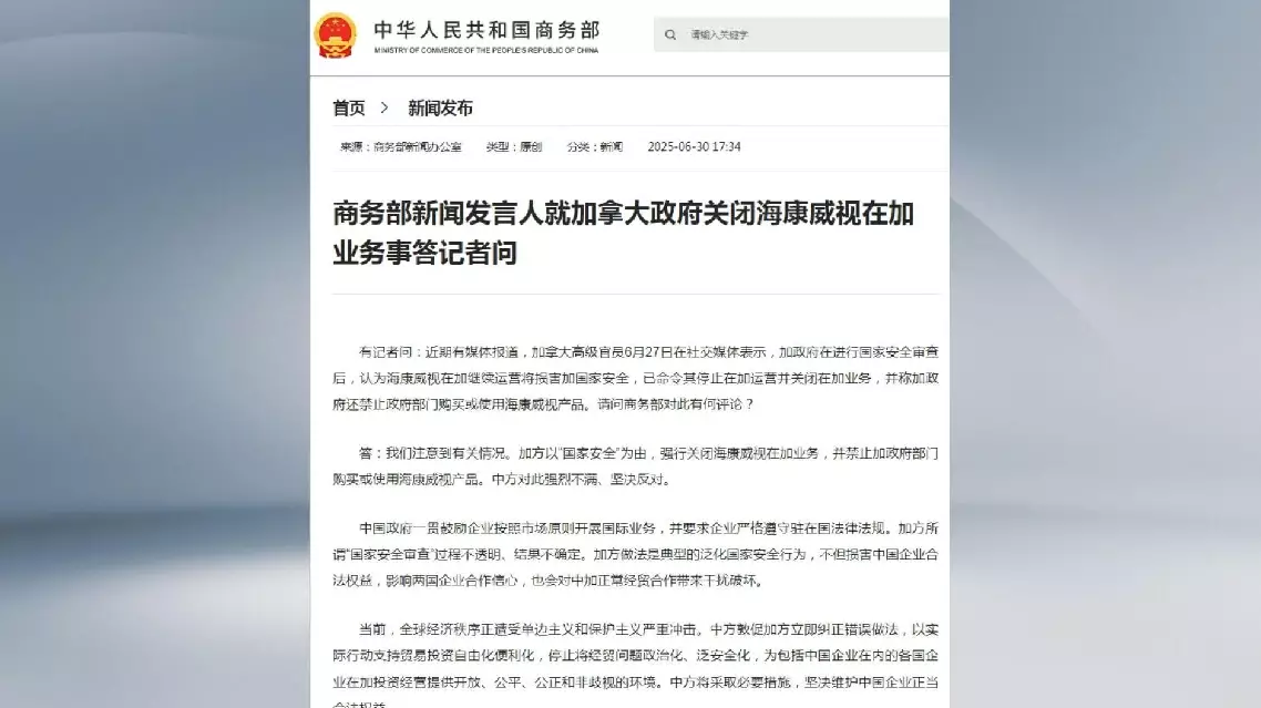 China has noticed that the Canadian side has forcibly ceased Hikvision's operations in Canada and banned Canadian government departments from purchasing or using Hikvision products under the pretext of "national security," a spokesperson with the ministry said.