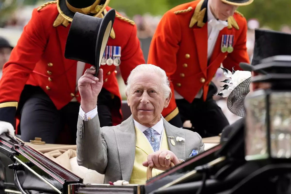 Britain's King Charles III arrives by royal carriage during day five of Royal Ascot at Ascot Racecourse, England, Saturday June 21, 2025. (Andrew Matthews/PA via AP)