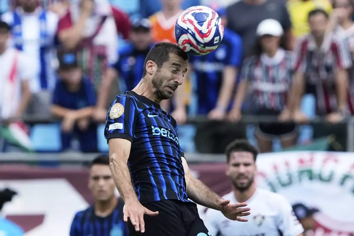 Inter Milan's Henrikh Mkhitaryan heads the ball during the Club World Cup round of 16 soccer match between Inter Milan and Fluminense in Charlotte, N.C., Monday, June 30, 2025. (AP Photo/Chris Carlson)