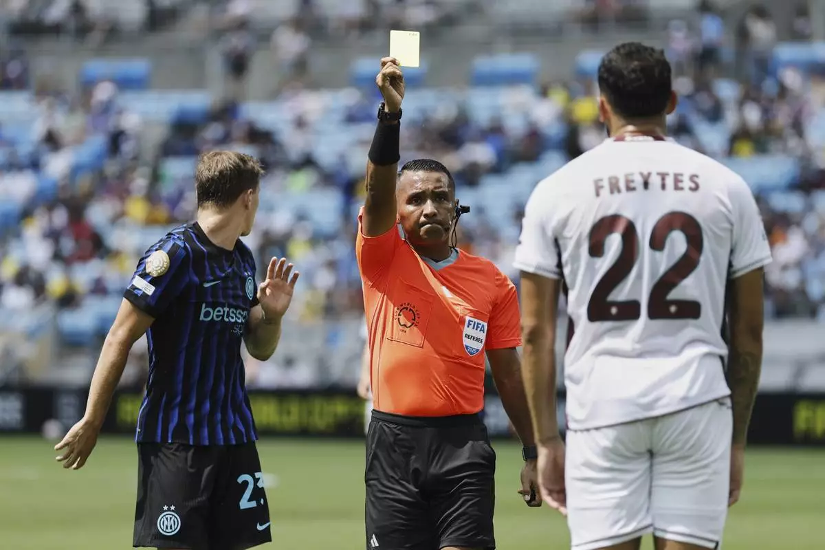 Referee Ivan Arcides Barton Cisneros, of El Salvador, shows the yellow card to Fluminense's Juan Pablo Freytes during the Club World Cup round of 16 soccer match between Inter Milan and Fluminense in Charlotte, N.C., Monday, June 30, 2025. (AP Photo/Chris Carlson)