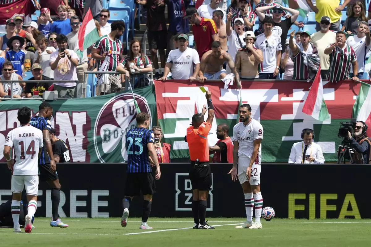 referee Ivan Arcides Barton Cisneros, of El Salvador, issues a yellow card to Fluminense's Juan Pablo Freytes (22) during the Club World Cup round of 16 soccer match between Inter Milan and Fluminense in Charlotte, N.C., Monday, June 30, 2025. (AP Photo/Nell Redmond)