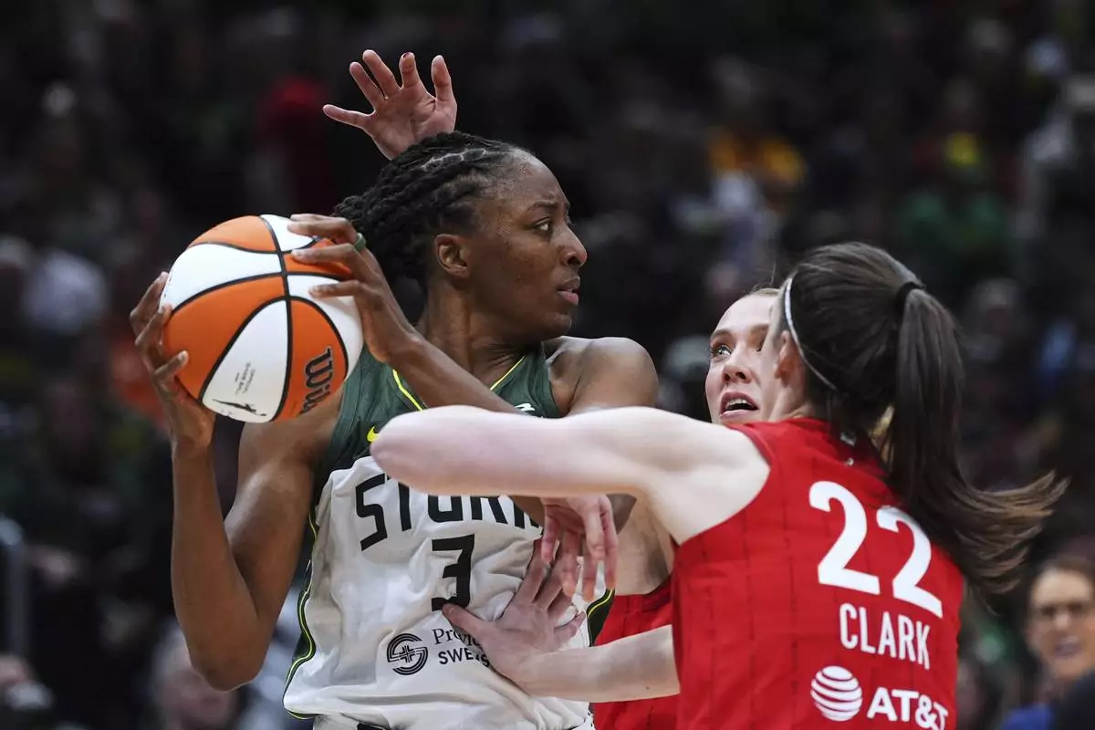 Seattle Storm forward Nneka Ogwumike, left, tries to look around the defense from Indiana Fever guard Lexie Hull, back and guard Caitlin Clark, right, during the second half of a WNBA basketball game Tuesday, June 24, 2025, in Seattle. (AP Photo/Lindsey Wasson)