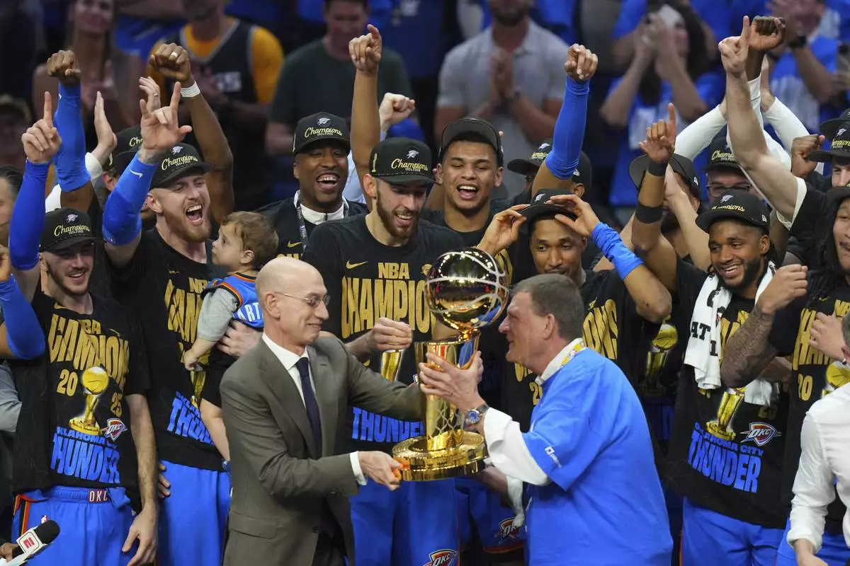 Clay Bennett, center right, chairman the ownership group of the Oklahoma City Thunder, receives the Larry O'Brien Championship Trophy from NBA Commissioner Adam Silver, center left, after winning the NBA basketball championship with a Game 7 victory against the Indiana Pacers Sunday, June 22, 2025, in Oklahoma City. (AP Photo/Nate Billings)