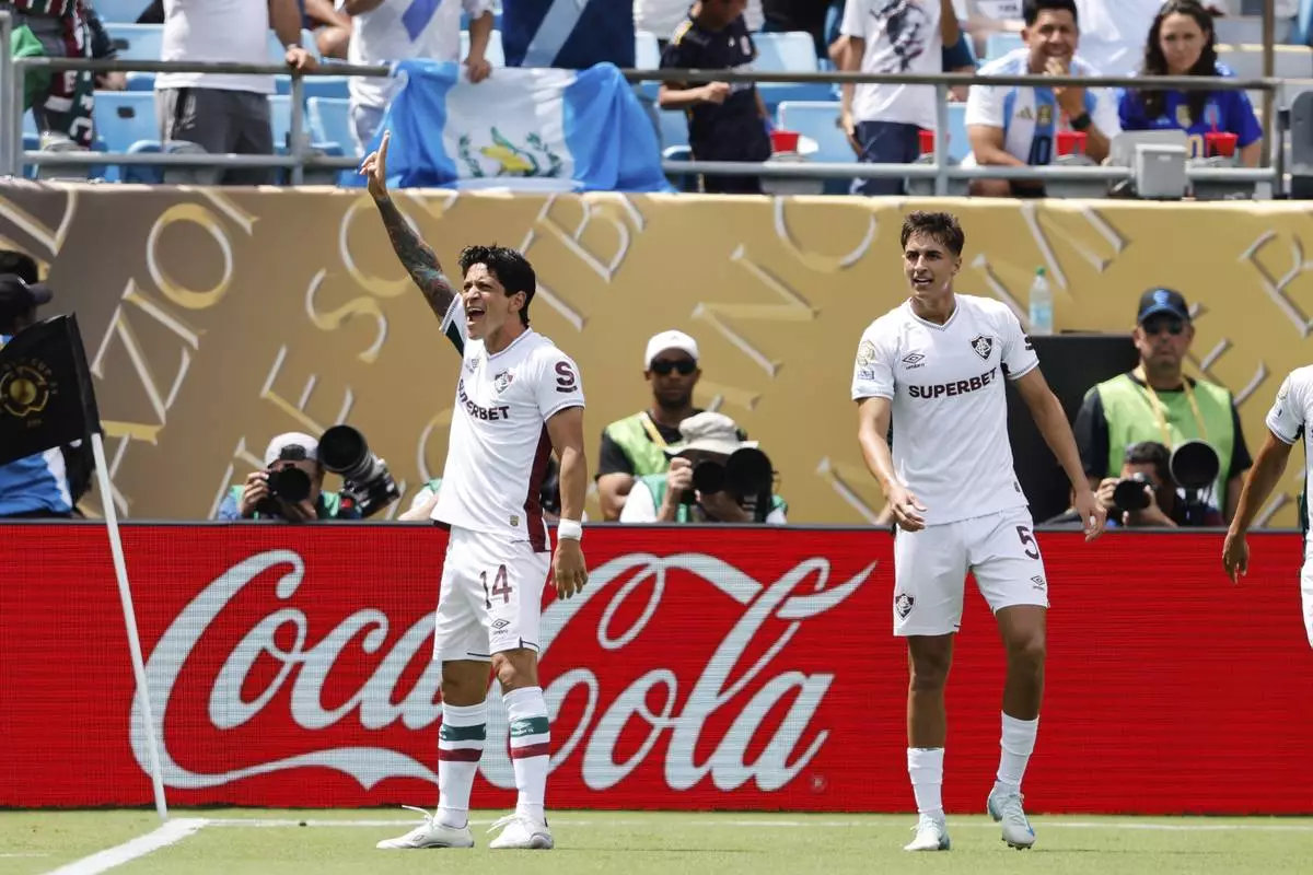 Fluminense's German Cano (14) celebrates after scoring his side's opening goal during the Club World Cup round of 16 soccer match between Inter Milan and Fluminense in Charlotte, N.C., Monday, June 30, 2025. (AP Photo/Nell Redmond)