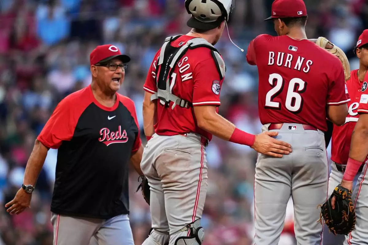Cincinnati Reds manager Terry Francona, left, pulls pitcher Chase Burns (26) during the first inning of a baseball game against the Boston Red Sox at Fenway Park, Monday, June 30, 2025, in Boston. (AP Photo/Charles Krupa)