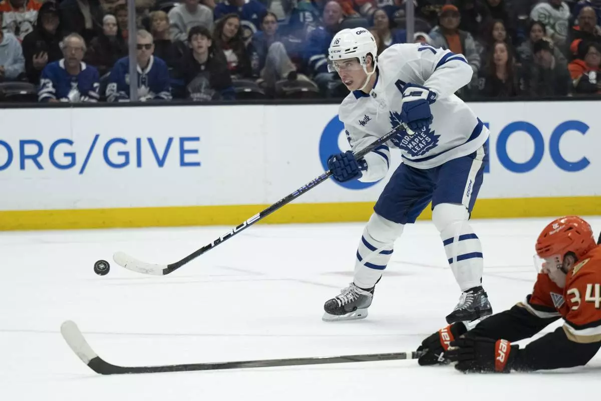 FILE - Toronto Maple Leafs right wing Mitch Marner (16) shoots past Anaheim Ducks defenseman Pavel Mintyukov (34) during the second period of an NHL hockey game, March 30, 2025, in Anaheim, Calif. (AP Photo/Kyusung Gong, file)