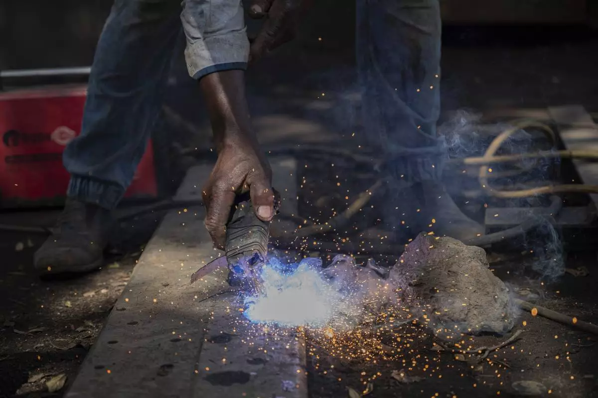 Mahamudu Bitego, a welder, works at his business in Goma, Congo, May 23, 2025 (AP Photo/Moses Sawasawa)