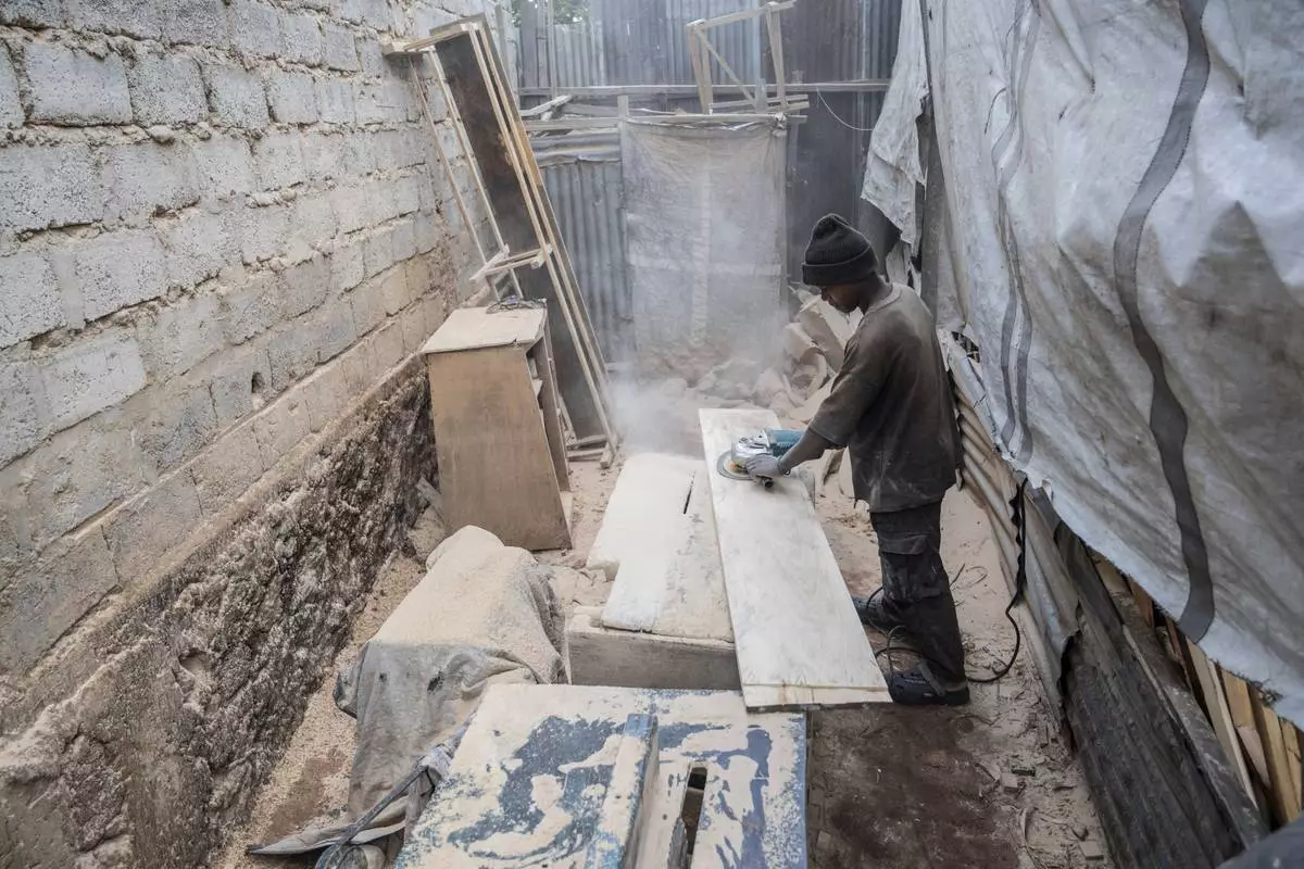 Isaac works in a carpentry shop that is powered in part by solar energy in Goma, Congo, May 23, 2025. (AP Photo/Moses Sawasawa)