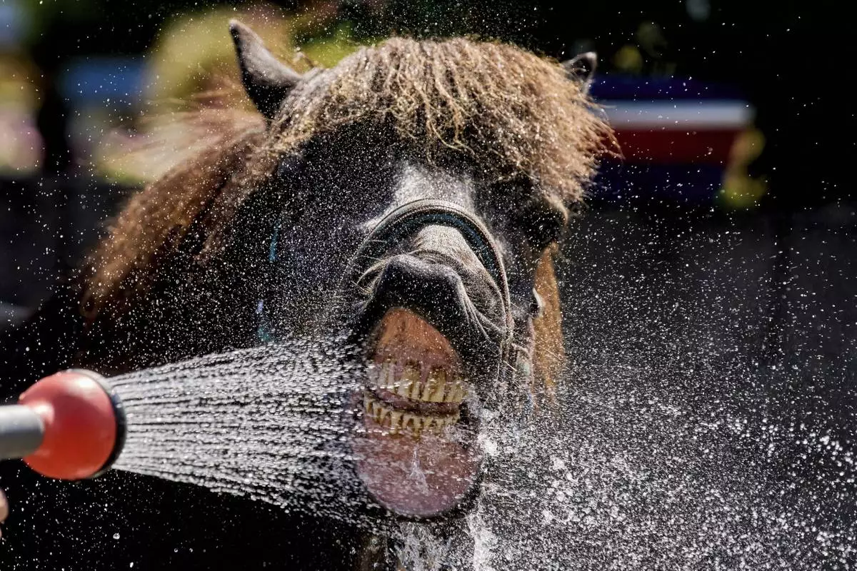 An Icelandic horse drinks water from a water hose at a stud farm in Wehrheim near Frankfurt, Germany, Monday, June 30, 2025, at the beginning of a multi-day heat wave. (AP Photo/Michael Probst)