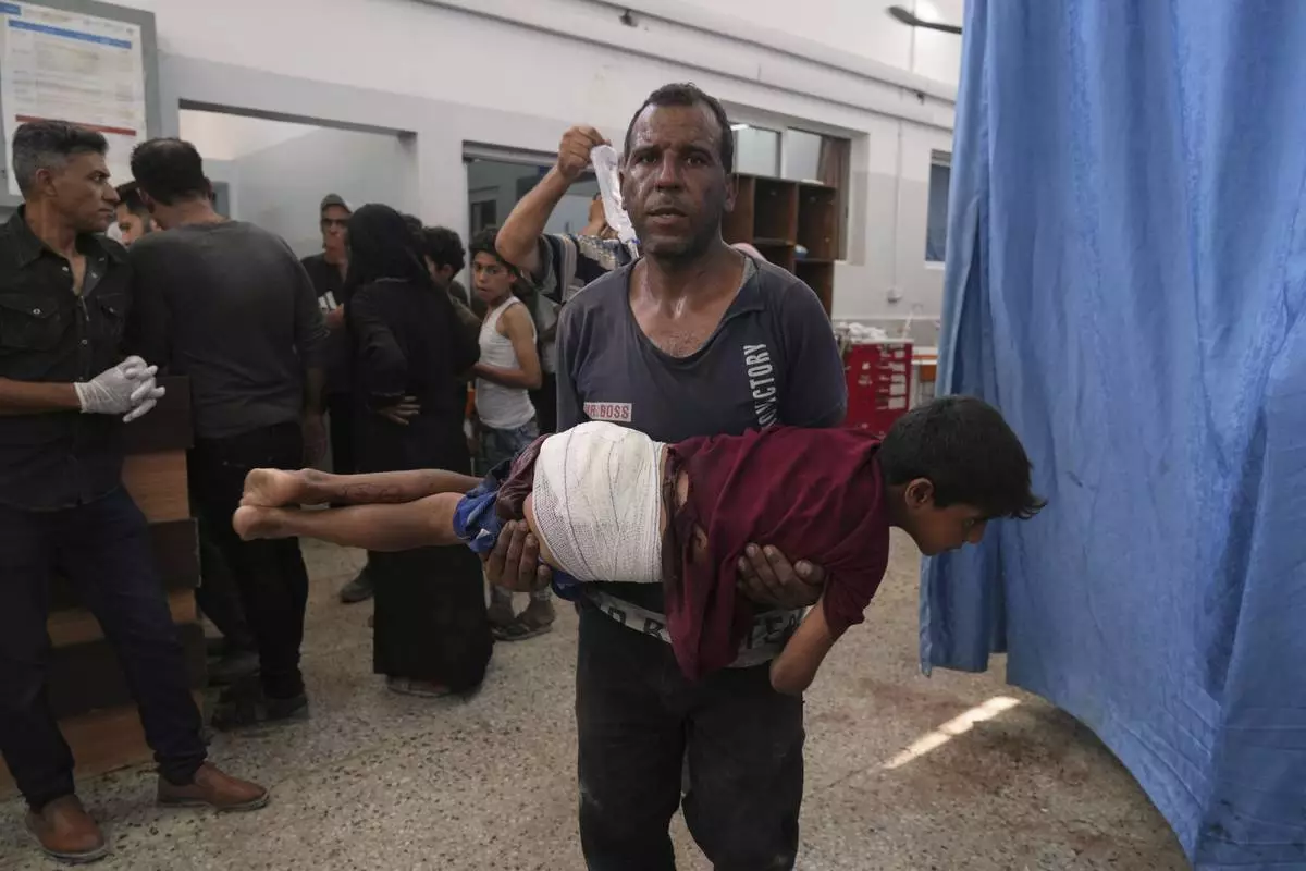 A man carries a child, who was wounded in an Israeli strike, after being treated in the Shifa Hospital, Gaza City, Monday, June 30, 2025. (AP Photo/Jehad Alshrafi)