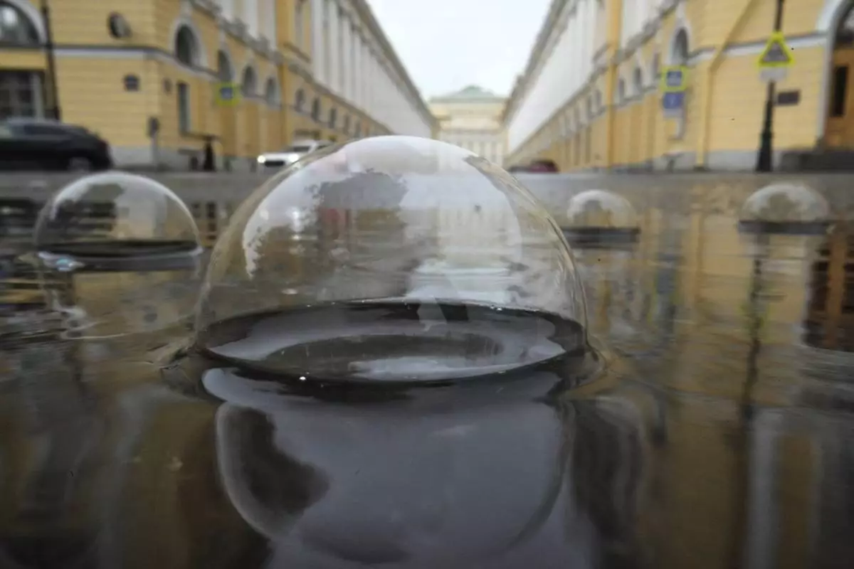 Bubbles form on a puddle during rainfall in central St. Petersburg, Russia, Sunday, June 29, 2025. (AP Photo/Dmitri Lovetsky)