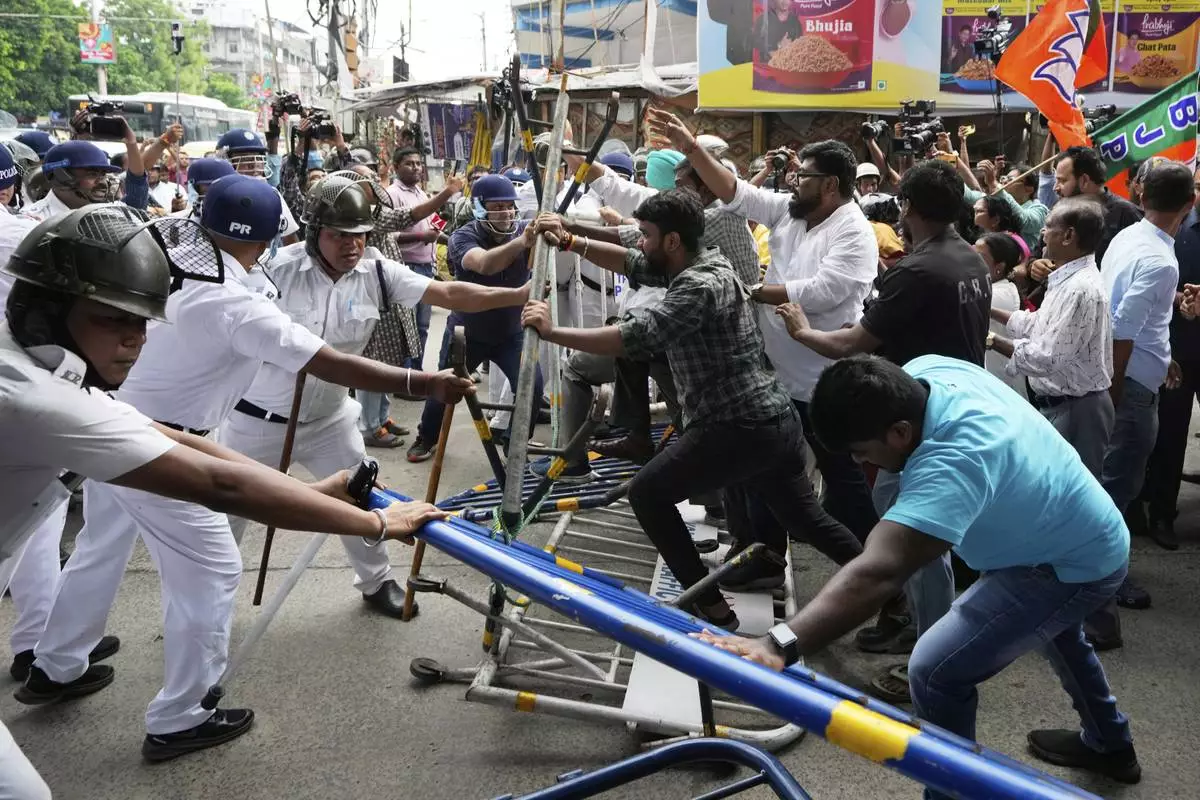 Supporters of ruling Bharatiya Janata Party break a police barricade as they march in a protest over the alleged rape of a student at the South Calcutta Law College campus on Wednesday, in Kolkata, India, Saturday, June 28, 2025. (AP Photo/Bikas Das)