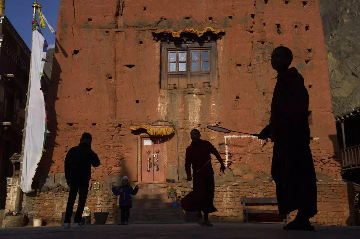 Monks play badminton in front of a monastery at Kagbeni, Mustang region, 462 kilometers (288 miles) west of Kathmandu, Nepal, Thursday, April 17, 2025. (AP Photo/Niranjan Shrestha)