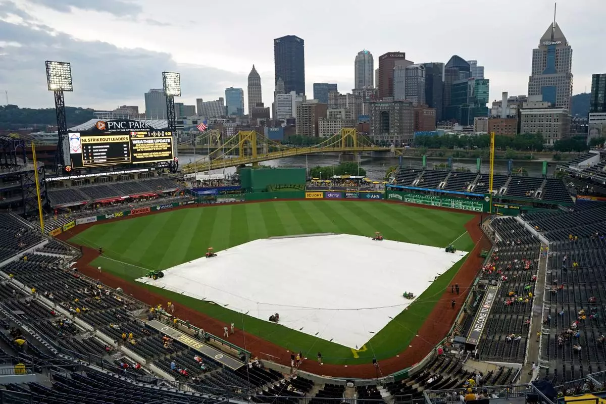 A tarp covers the infield during a rain delay before a baseball game between the Pittsburgh Pirates and the St. Louis Cardinals, Monday, June 30, 2025, in Pittsburgh. (AP Photo/Matt Freed)