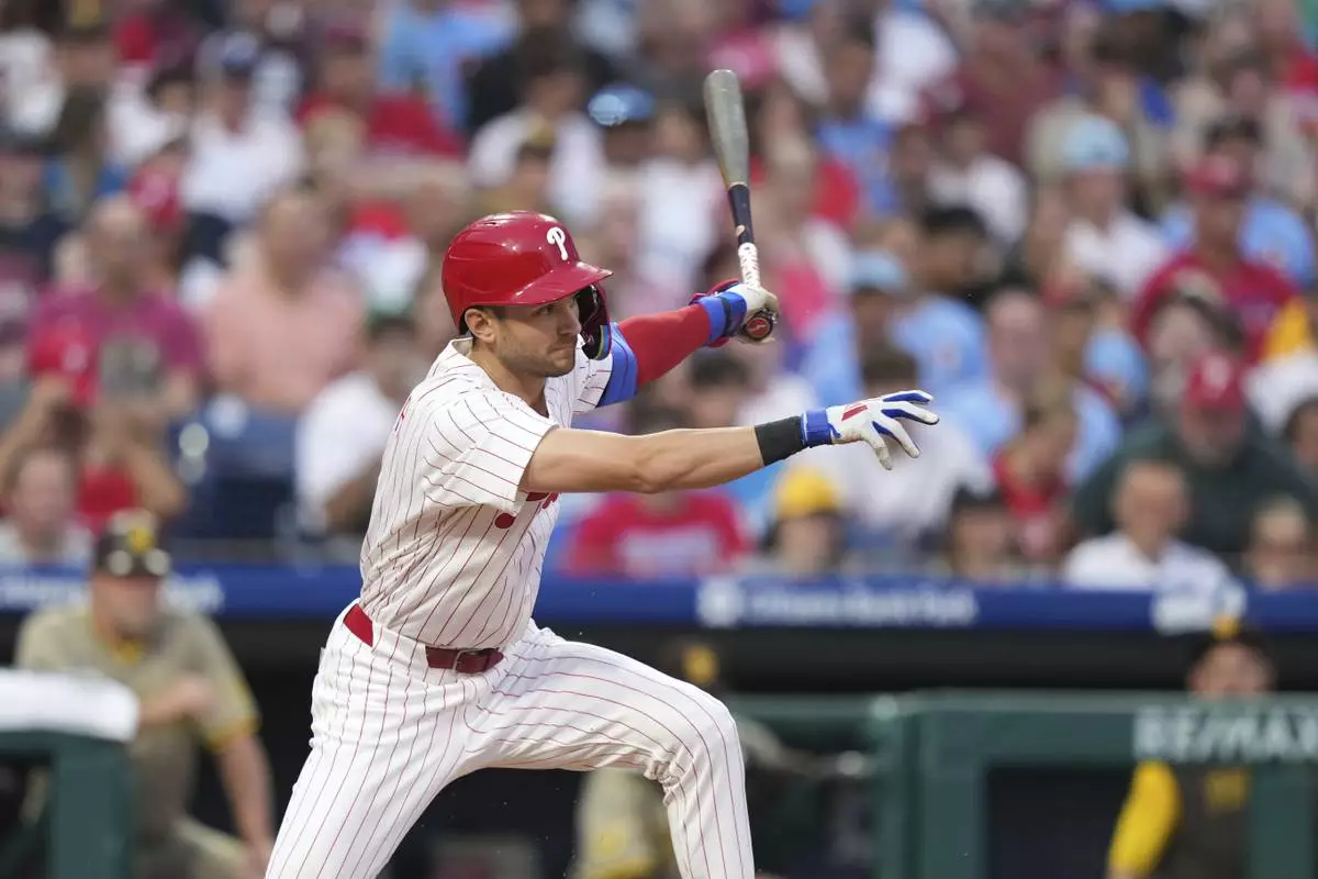 Philadelphia Phillies' Trea Turner follows through after hitting a run-scoring single against San Diego Padres pitcher Matt Waldron during the fourth inning of a baseball game Monday, June 30, 2025, in Philadelphia. (AP Photo/Matt Slocum)