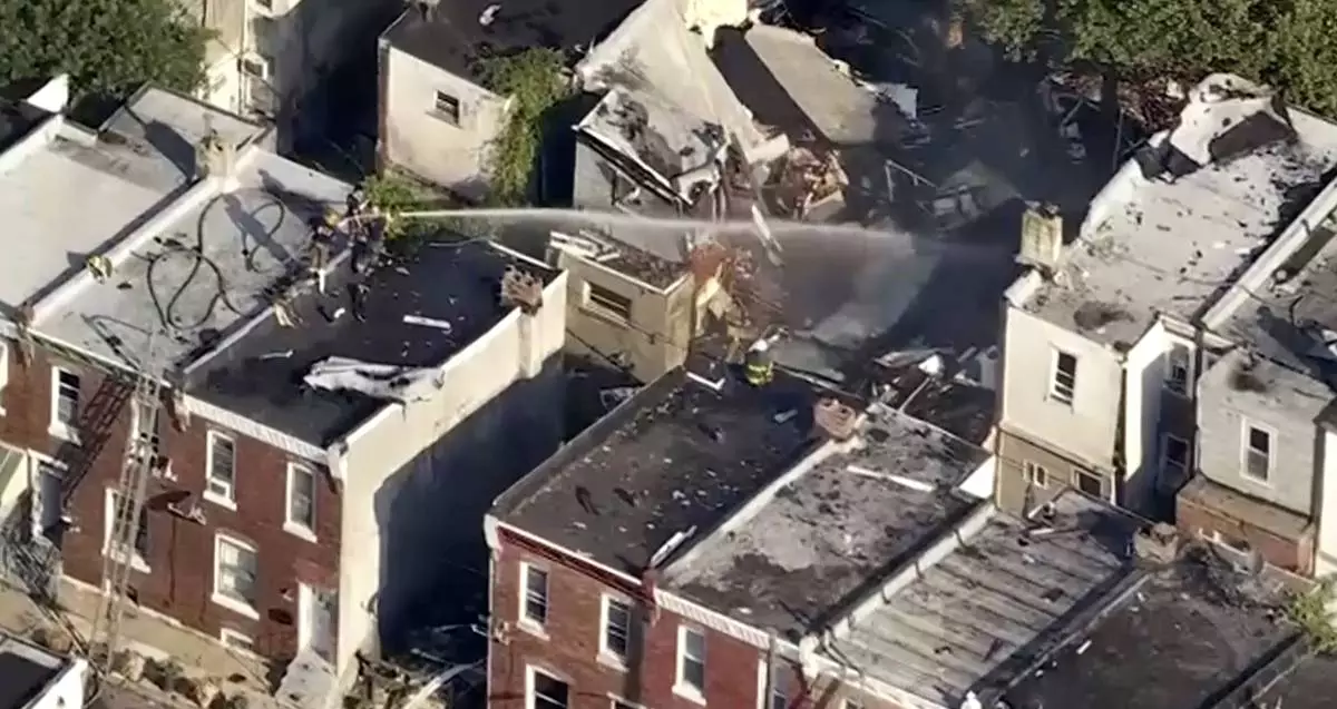 This aerial video image provided by WPVI shows firefighters working on the aftermath of an explosion in Philadelphia, Sunday, June 29, 2025. (WPVI-TV via AP)
