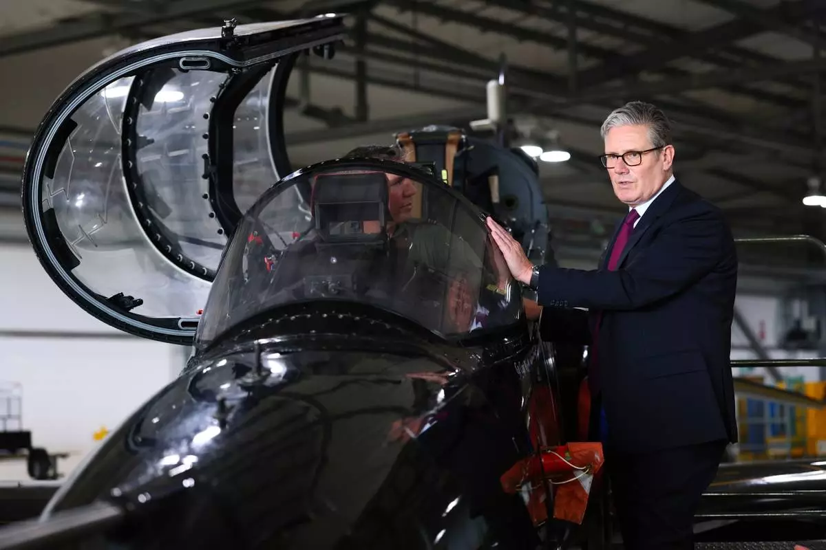 Britain's Prime Minister Keir Starmer is shown a Hawk T2, the RAF's premier fast jet trainer during a visit to RAF Valley, Anglesey, north Wales, Friday June 27, 2025. (Paul Currie/Pool via AP)