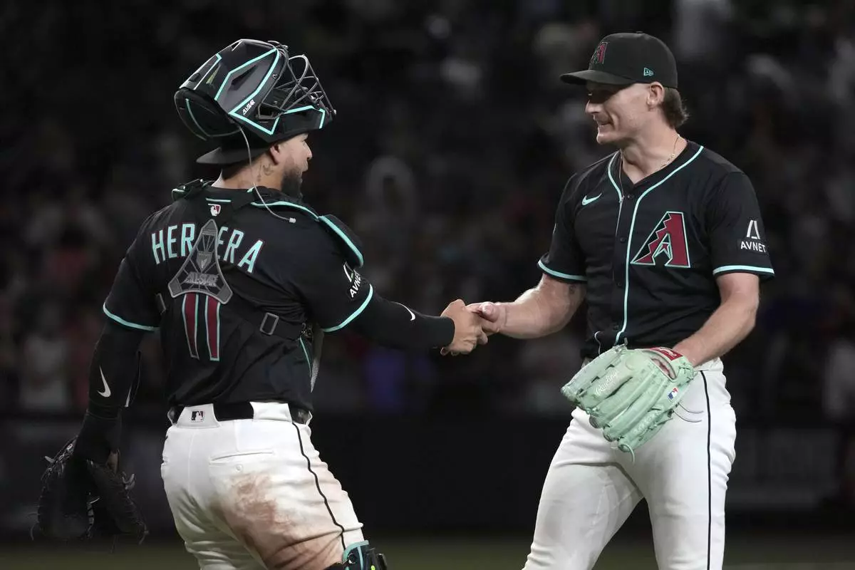 Arizona Diamondbacks catcher Jose Herrera (11) and pitcher Shelby Miller celebrate after defeating the San Francisco Giants during a baseball game, Monday, June 30, 2025, in Phoenix. (AP Photo/Rick Scuteri)