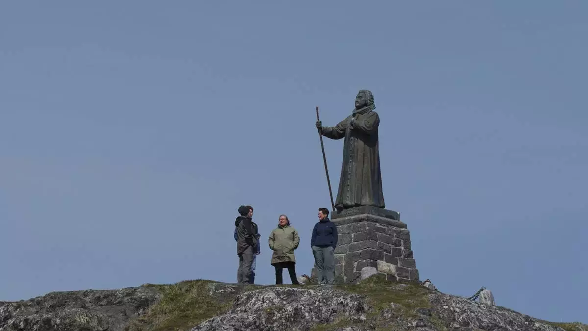 Tourists stand in front of the Statue of Hans Egede in Nuuk, Greenland, Sunday, June 22, 2025. (AP Photo/Kwiyeon Ha)