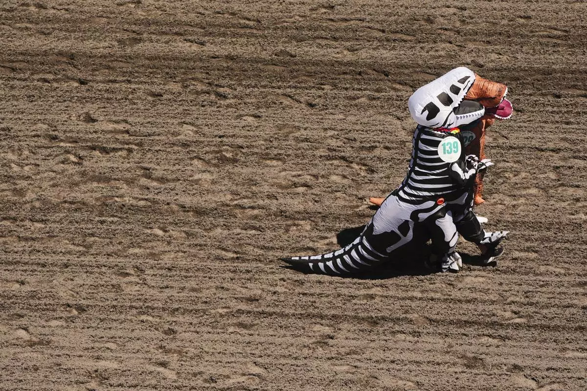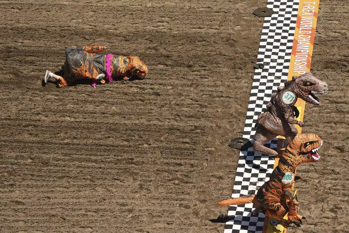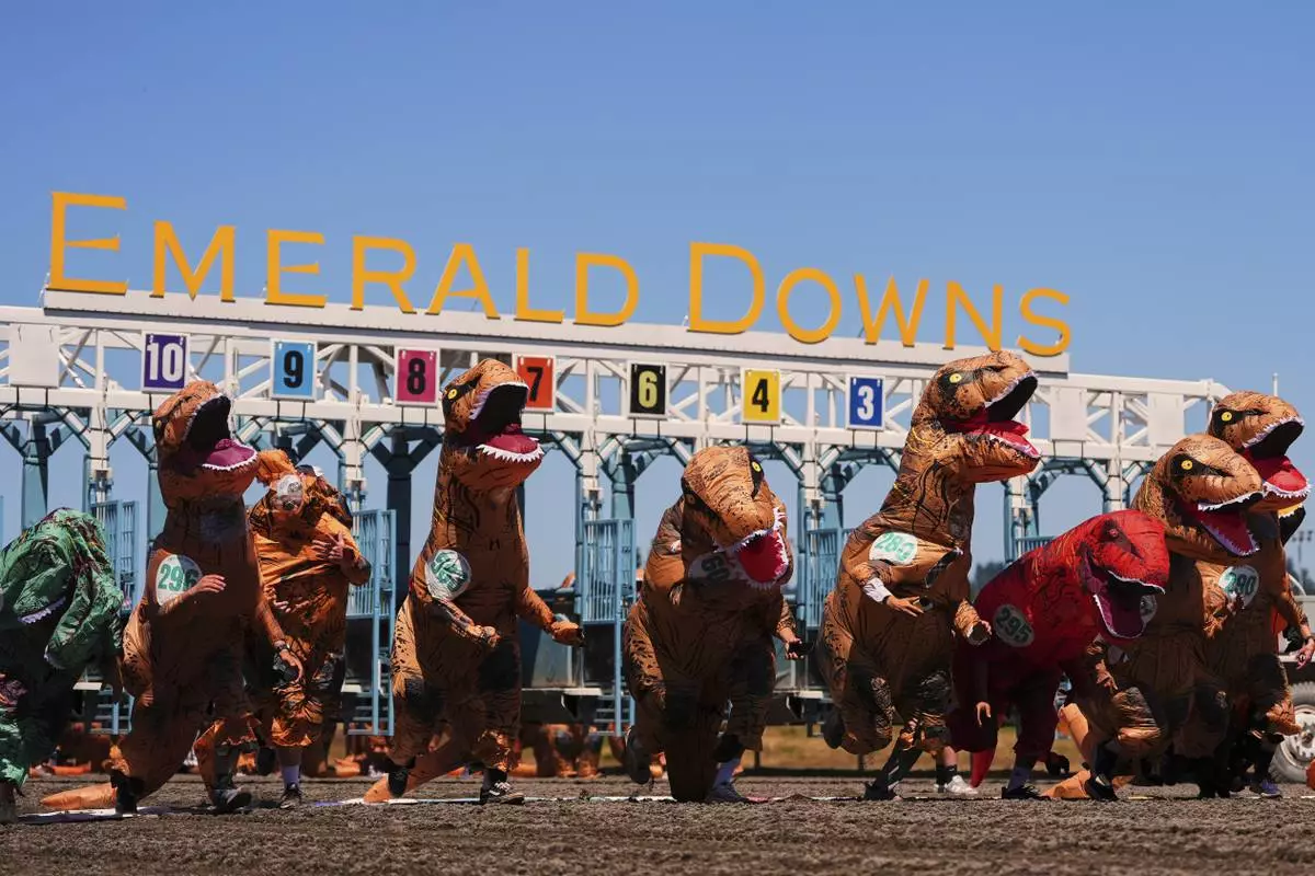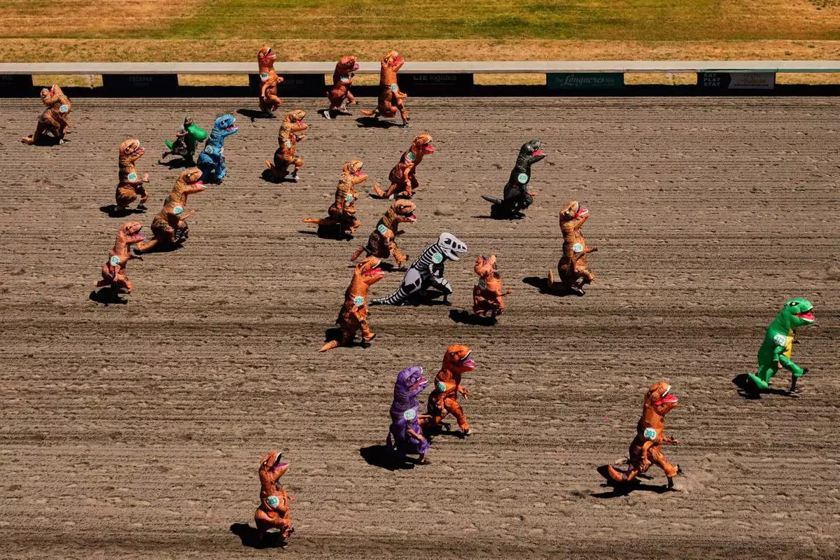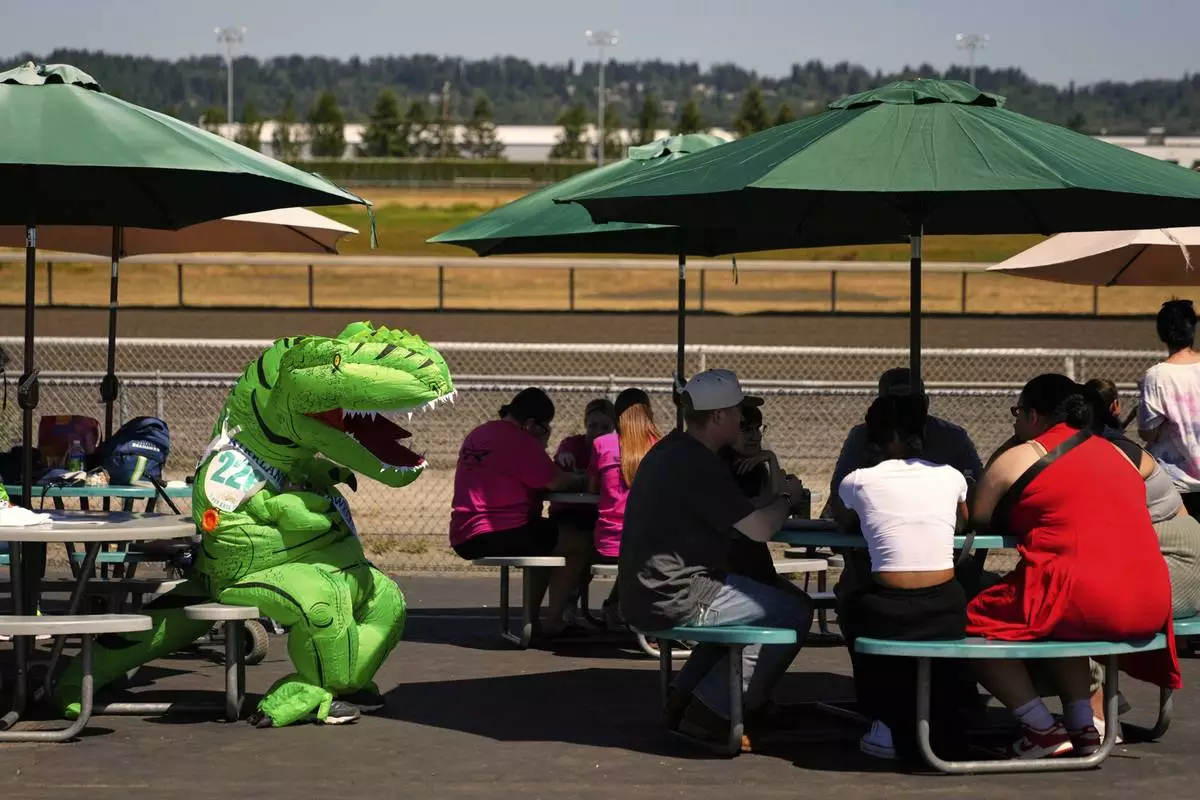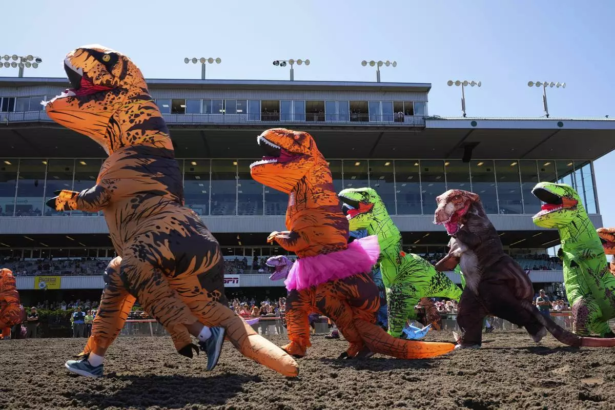 AUBURN, Wash. (AP) — Spectators cheered as participants ran down the track cloaked in inflatable Tyrannosaurus rex costumes during the T-Rex World Championship Races at Emerald Downs in Auburn, Washington.