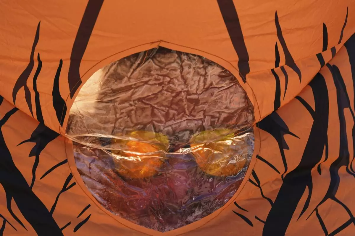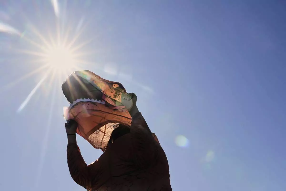A participant's viewing cutout fogs up in the heat during the "T-Rex World Championship Races" at Emerald Downs, Sunday, June 29, 2025, in Auburn, Wash. (AP Photo/Lindsey Wasson)