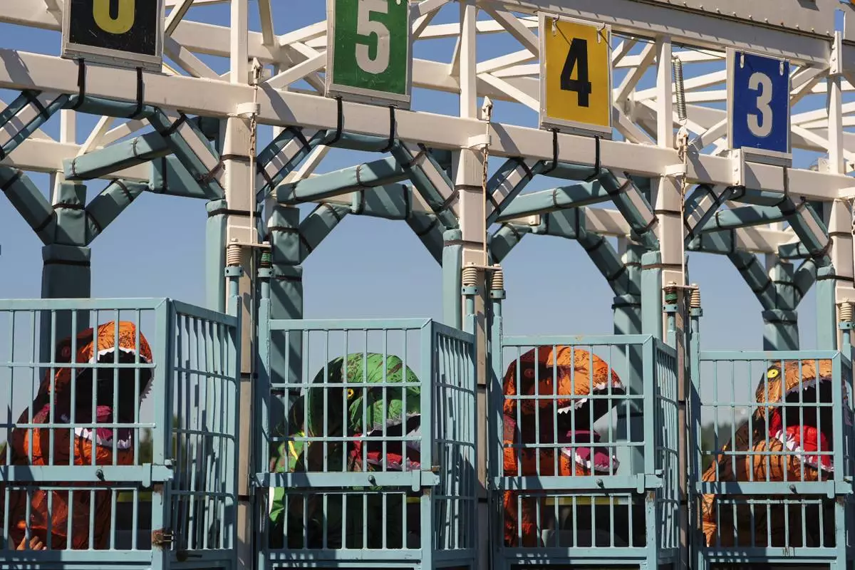 Racers wait in their gates before the men's championship during the "T-Rex World Championship Races" at Emerald Downs, Sunday, June 29, 2025, in Auburn, Wash. (AP Photo/Lindsey Wasson)