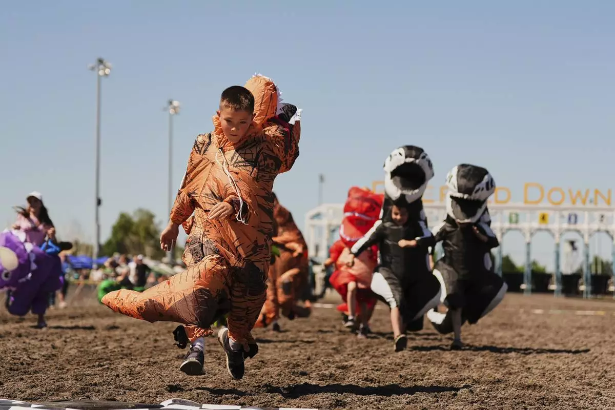 A young participant nears the finish line during the kids' race during the "T-Rex World Championship Races" at Emerald Downs, Sunday, June 29, 2025, in Auburn, Wash. (AP Photo/Lindsey Wasson)