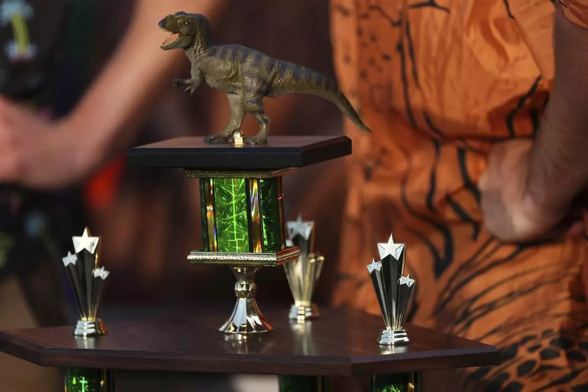 A participant T-Rex sits before a race during the "T-Rex World Championship Races" at Emerald Downs, Sunday, June 29, 2025, in Auburn, Wash. (AP Photo/Lindsey Wasson)