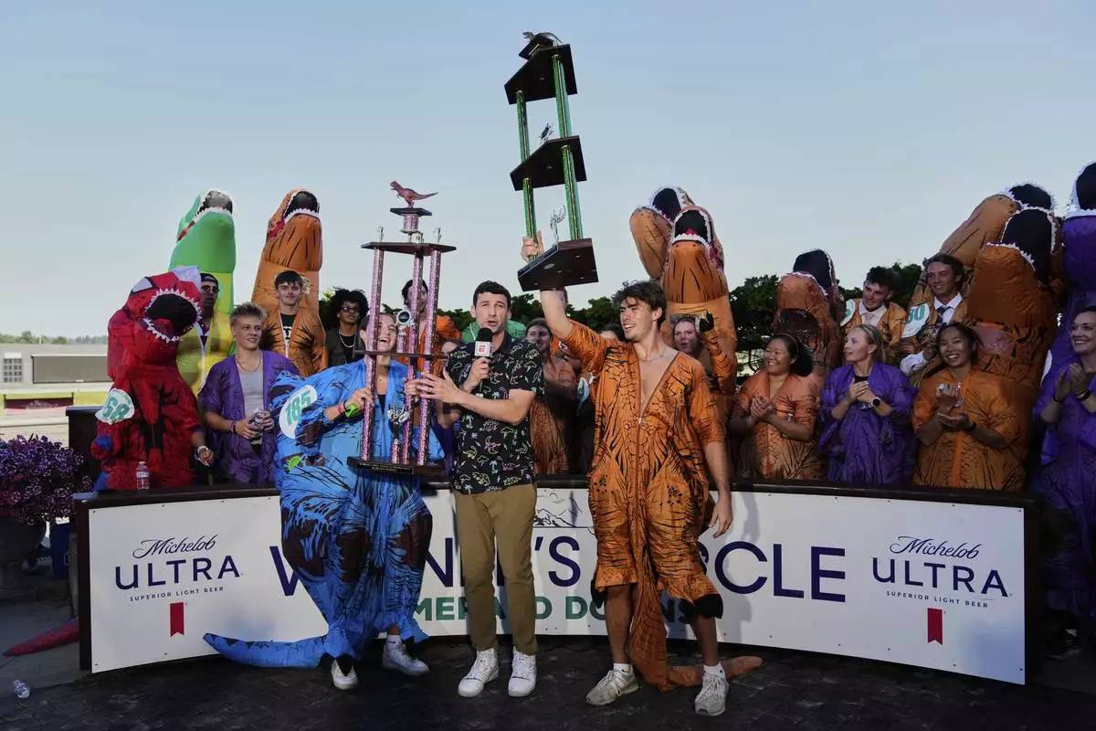 Women's winner Linsey Lovrovich, of Gig Harbor, Wash., at left, and men's winner Andrew Stuber of Houston at right, celebrate with their trophies after participating in the "T-Rex World Championship Races" at Emerald Downs, Sunday, June 29, 2025, in Auburn, Wash. (AP Photo/Lindsey Wasson)