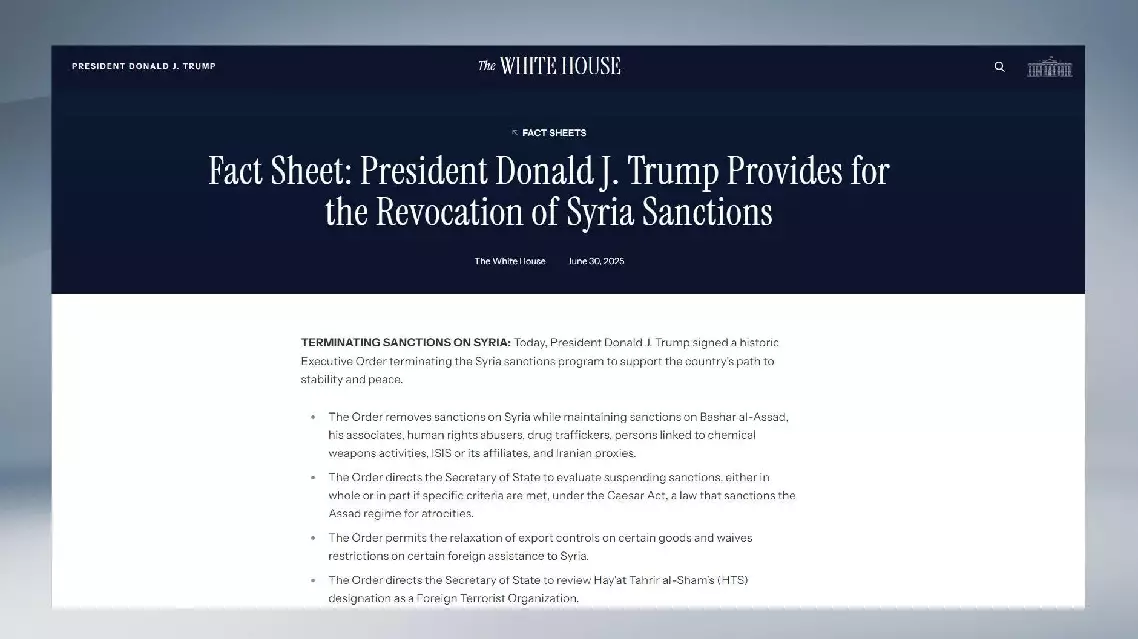 "The Order removes sanctions on Syria while maintaining sanctions on (ousted former Syrian president) Bashar al-Assad... The Order permits the relaxation of export controls on certain goods and waives restrictions on certain foreign assistance to Syria," said the White House.