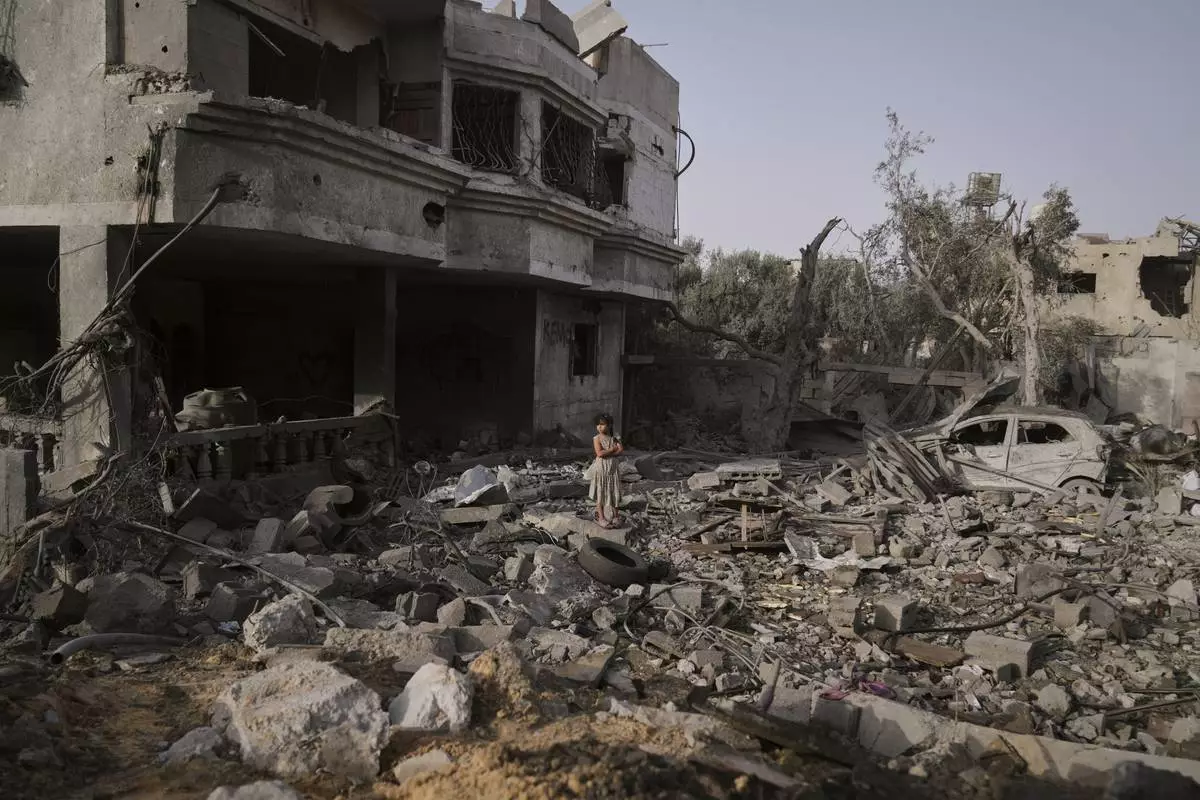 A Palestinian girl stands atop the rubble of the Al-Aimawi family's home that was destroyed by Israeli airstrikes in Al-Zawaideh, Gaza Strip, Tuesday, July 1, 2025. (AP Photo/Abdel Kareem Hana)