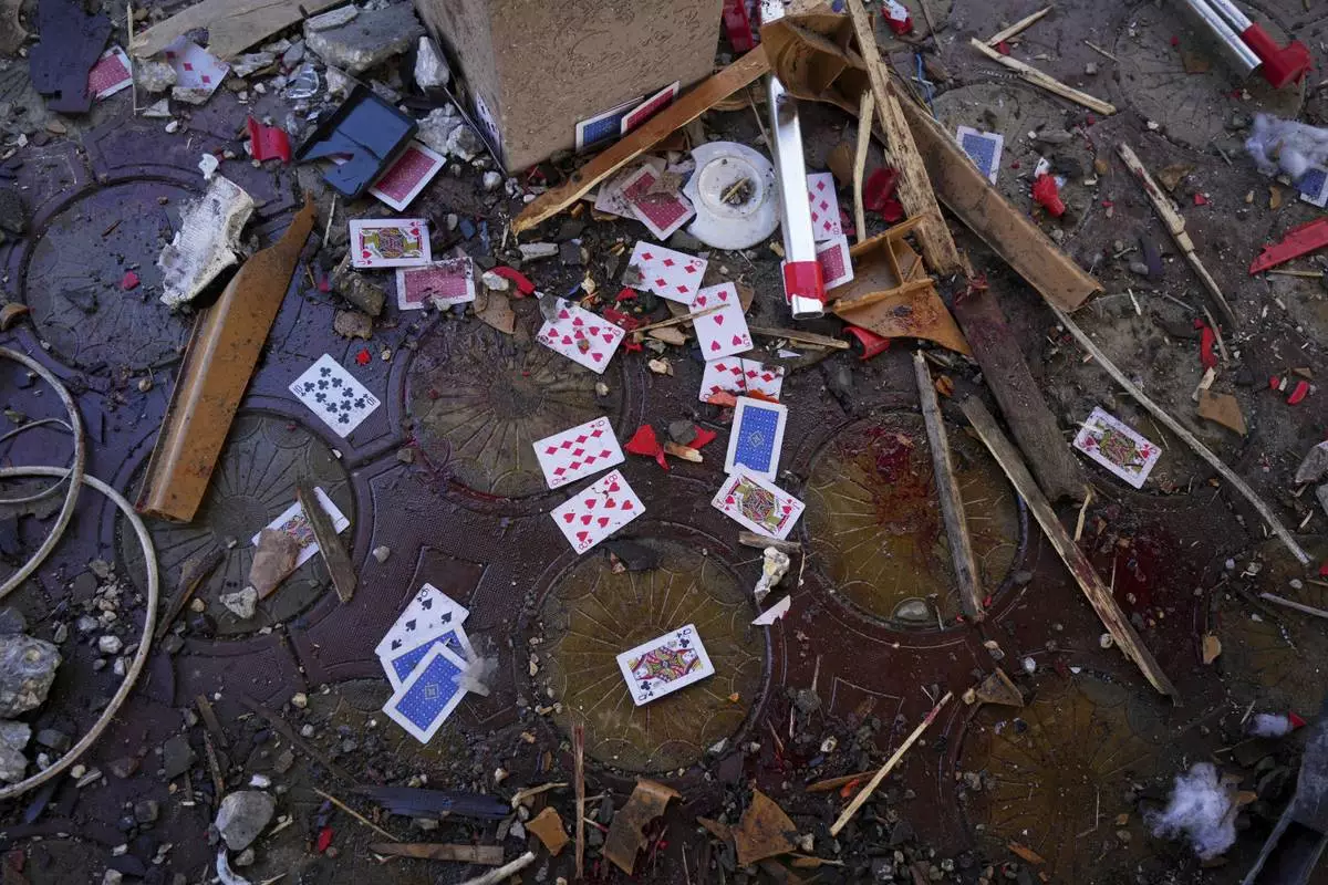 Blood, rubble, and a deck of cards lie scattered in a café after it was hit by an Israeli airstrike that killed more than 30 people near the port in Gaza City, Monday, June 30, 2025. (AP Photo/Jehad Alshrafi)