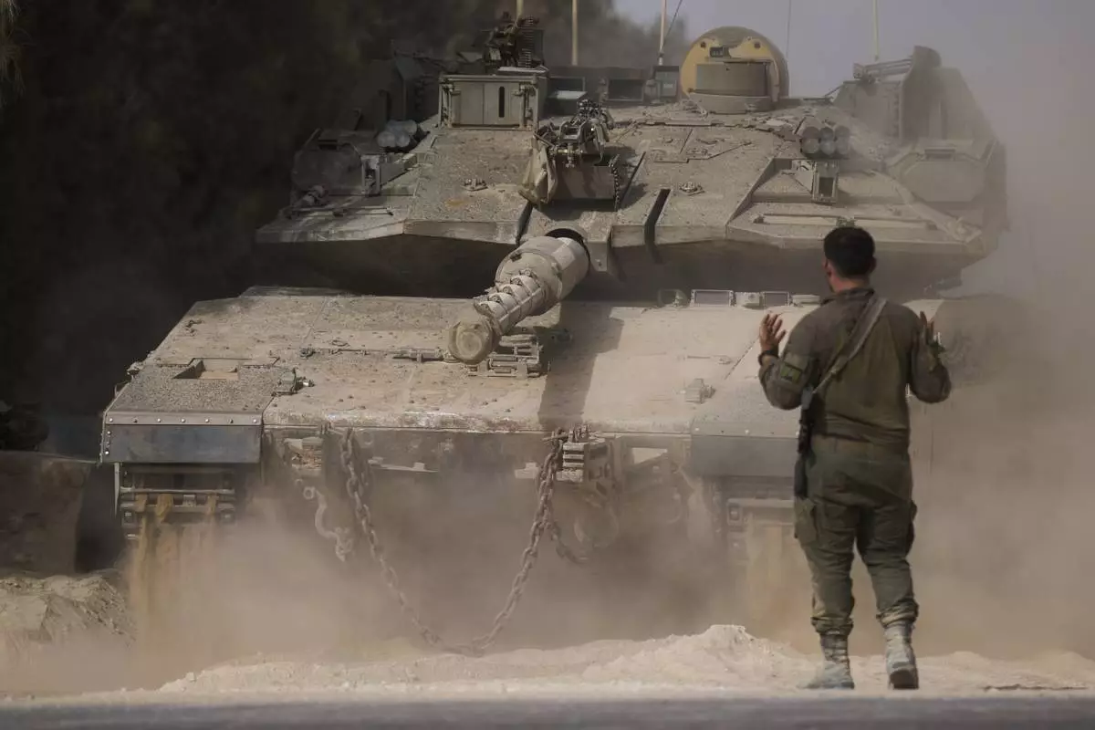 An Israeli soldier directs a tank at a staging area near the border with the Gaza Strip, in southern Israel, Tuesday, July 1, 2025. (AP Photo/Ariel Schalit)