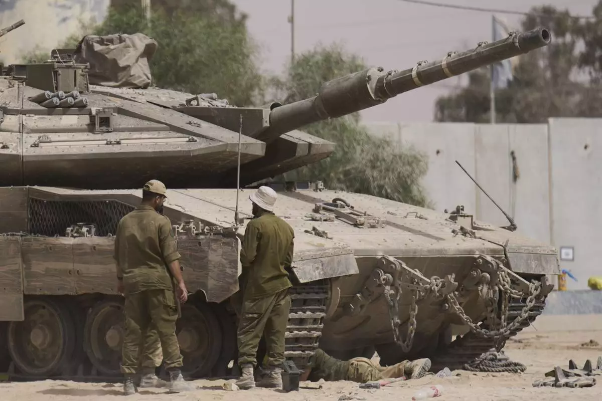 Israeli soldiers work on a tank at a staging area near the border with the Gaza Strip, in southern Israel, Tuesday, July 1, 2025. (AP Photo/Ariel Schalit)